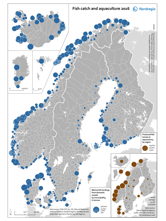 This map shows marine fishing landings from domestic vessels in tonnes by Nordic municipality in 2016. The small map shows the production of fish in aquaculture in tonnes by Nordic Region in 2016.