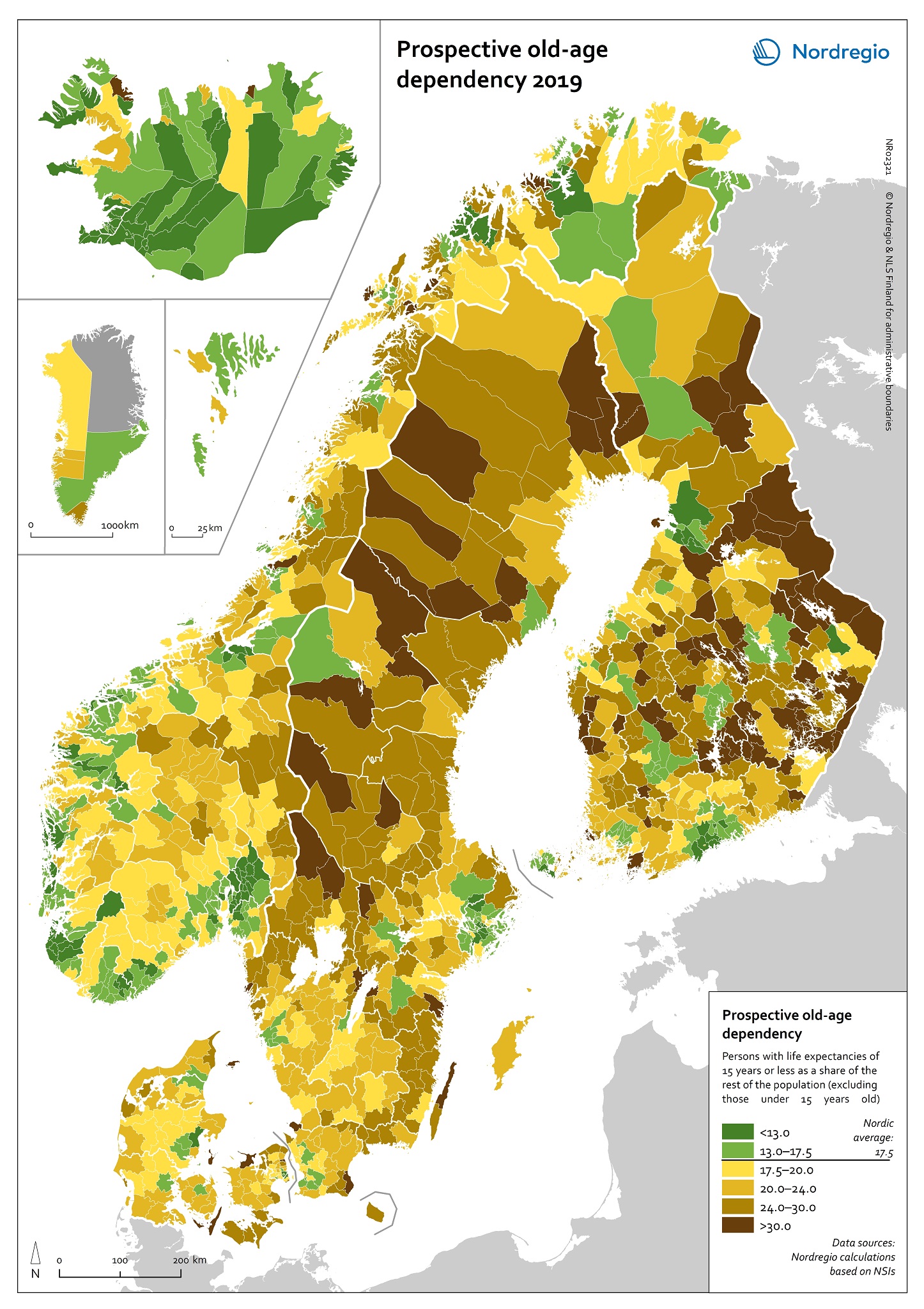 The darker brown municipalities in the map indicate a higher POADR while the green municipalities have the lowest levels observed. As shown in the map, internal differences in the countries shows that many rural and sparsely populated municipalities have a high ratio. Particularly in northern parts of Sweden and Finland.