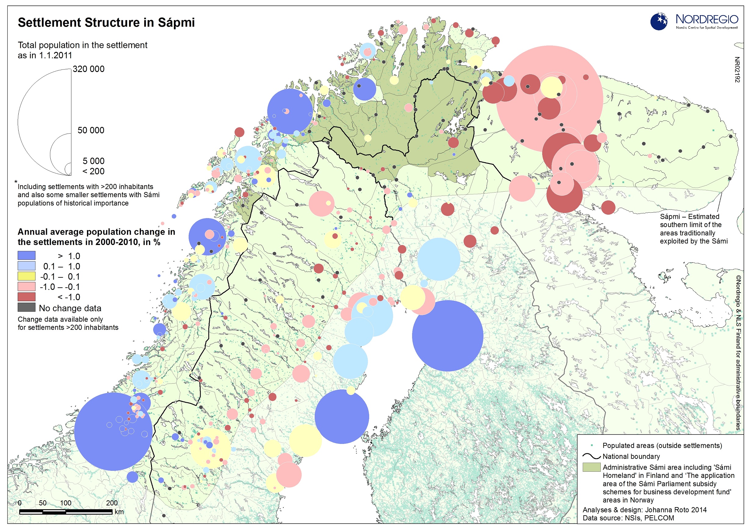 The Sápmi is home to some 2 million people, who, in a geographical sense, inhabit rather unevenly a large land area. The division of the population can be seen from three different perspectives or spatial dichotomies, between west and east, coastal and inland and urban and rural areas. The East –West divide results from the differences in settlement pattern between the Nordic Countries with relatively many small and medium size cities and the Kola Peninsula where almost one million people live in a small number large settlements. The coastal and inland division reflects traditional or, historical, settlement patterns where major settlements where located in coastal areas or along main rivers while inland areas were mainly uninhabited or populated only by a limited number of small, permanent, settlements. Finally, the urban-rural divide reflects rather more current population dynamics where more and more people are now living in the cities and the rural areas are struggling to combat outward migration. Currently some 65% of the population in Sápmi live in settlements with at least 10 000 inhabitants and in the Kola Peninsula the share of those living in such settlements is over 85%. During the last 20 years the total population in Sápmi has decreased by 14%. This decrease has taken place primarily in the rural areas and in small settlements. Many of the larger cities and some smaller settlements have however experienced a population increase. In this context, the Norwegian cities of Tromsø, Bodø and Alta in particular, as well as some smaller settlements with good regional assets like tourism and fishing, have experienced positive demographic development.