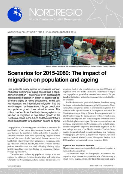 Given the current and expected continued migration into the Nordic region, it is useful to examine the demographic impact of international migration on the size and age structure of the Nordic countries. This brief summarizes the results of such scenarios contained in a Nordregio working paper, The impact of migration on projected population trends in Denmark, Finland, Iceland, Norway and Sweden: 2015-2080.