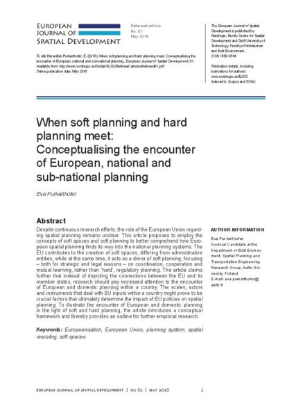 The EU contributes to the creation of soft spaces, differing from administrative entities, while at the same time, it acts as a driver of soft planning, focusing– both for strategic and legal reasons – on coordination, cooperation and mutual learning, rather than ‘hard’, regulatory planning. The article claims further that instead of depicting the connections between the EU and its member states, research should pay increased attention to the encounter of European and domestic planning within a country. The scales, actors and instruments that deal with EU inputs within a country might prove to be crucial factors that ultimately determine the impact of EU policies on spatial planning. To illustrate the encounter of European and domestic planning in the light of soft and hard planning, the article introduces a conceptual framework and thereby provides an outline for further empirical research.