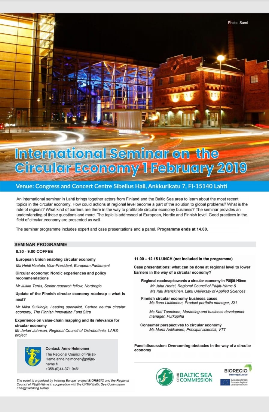 The seminar provides an understanding of these questions and more the topic is addressed at European, Nordic and Finnish level. Good practices in the field of the circular economy are presented as well.