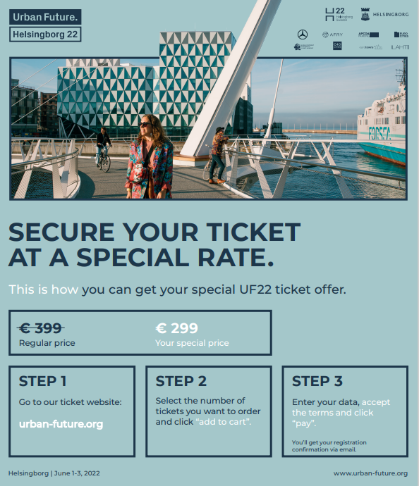 Together with Urban Future 22, we would like to offer you a special price to join us at the Urban Future Conference 1-2 June in Helsingborg: