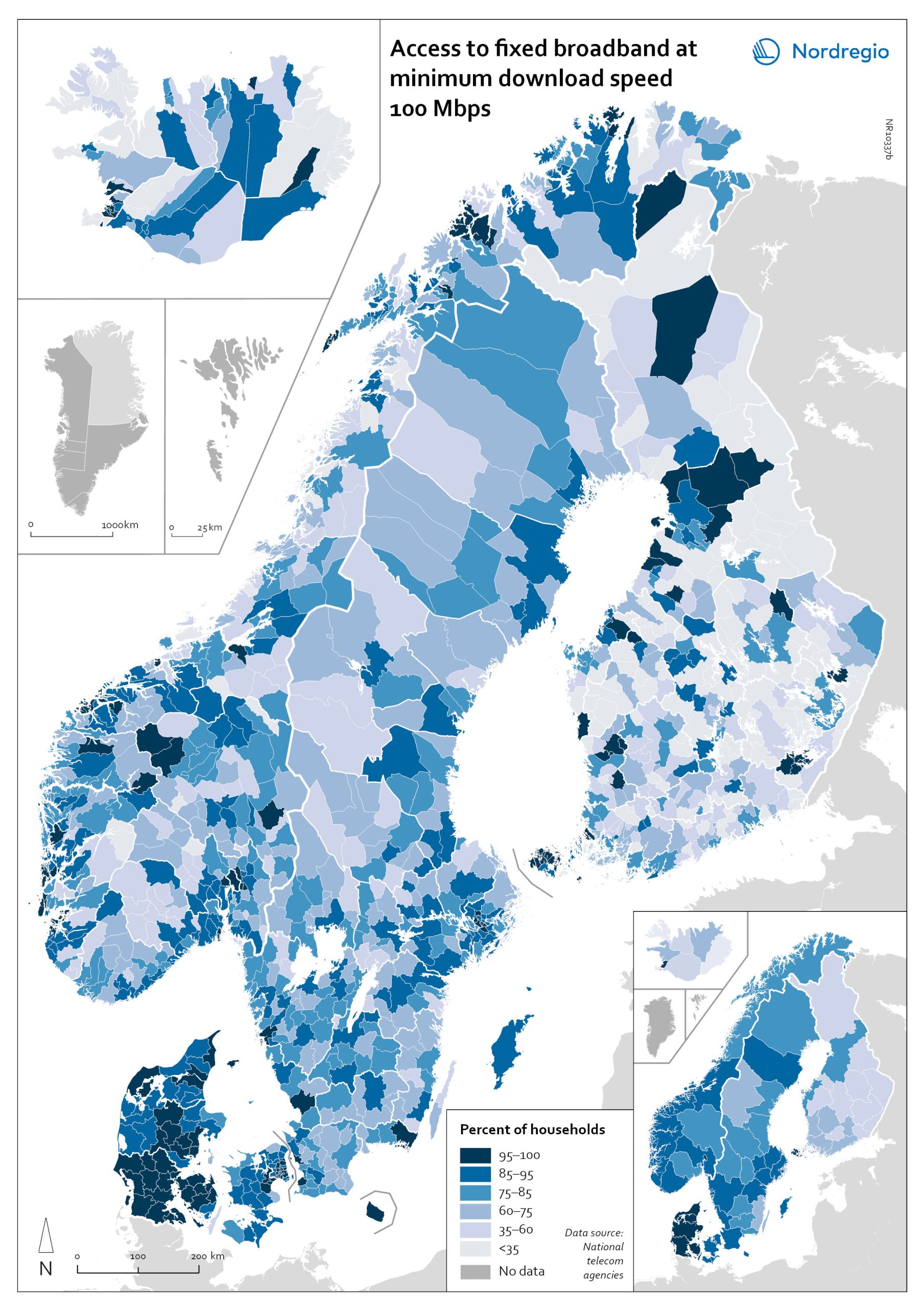 Overall, Denmark has the highest levels of connectivity, with 92% of municipalities providing superfast broadband to at least 85% of households. In over half (59%) of all Danish municipalities, almost all (>95%) of households have access to this connection speed. The lowest levels of connectivity are found in Finland. This is particularly evident in rural municipalities where, on average, less than half of households (48%) have access to superfast broadband. Connectivity levels are also rather low in some parts of Iceland, for example, the Westfjords and several municipalities in the east.