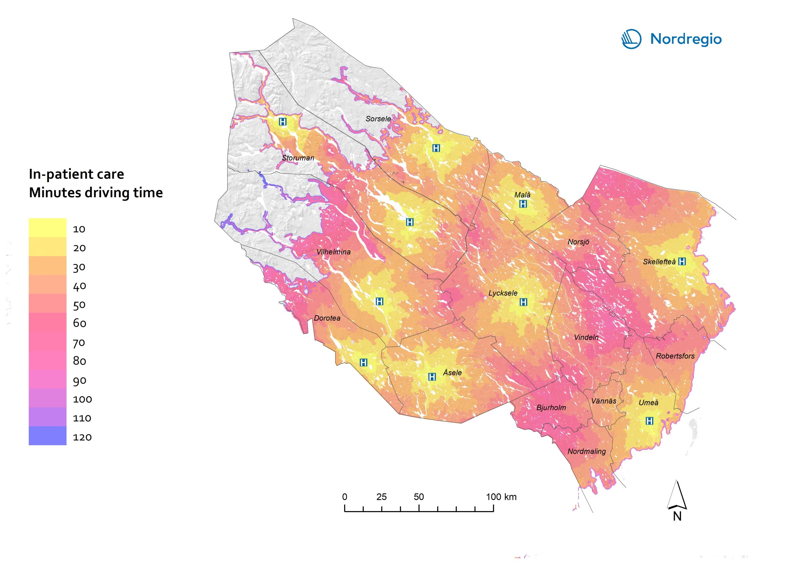 The map illustrates the accessibility of in-patient care in Västerbotten in Sweden. The colours represent car ride times in minutes from the place of residency to the nearest health care facility within a certain service type, with a travel range of 10 minutes to two hours. The health care facilities are also located on the map.