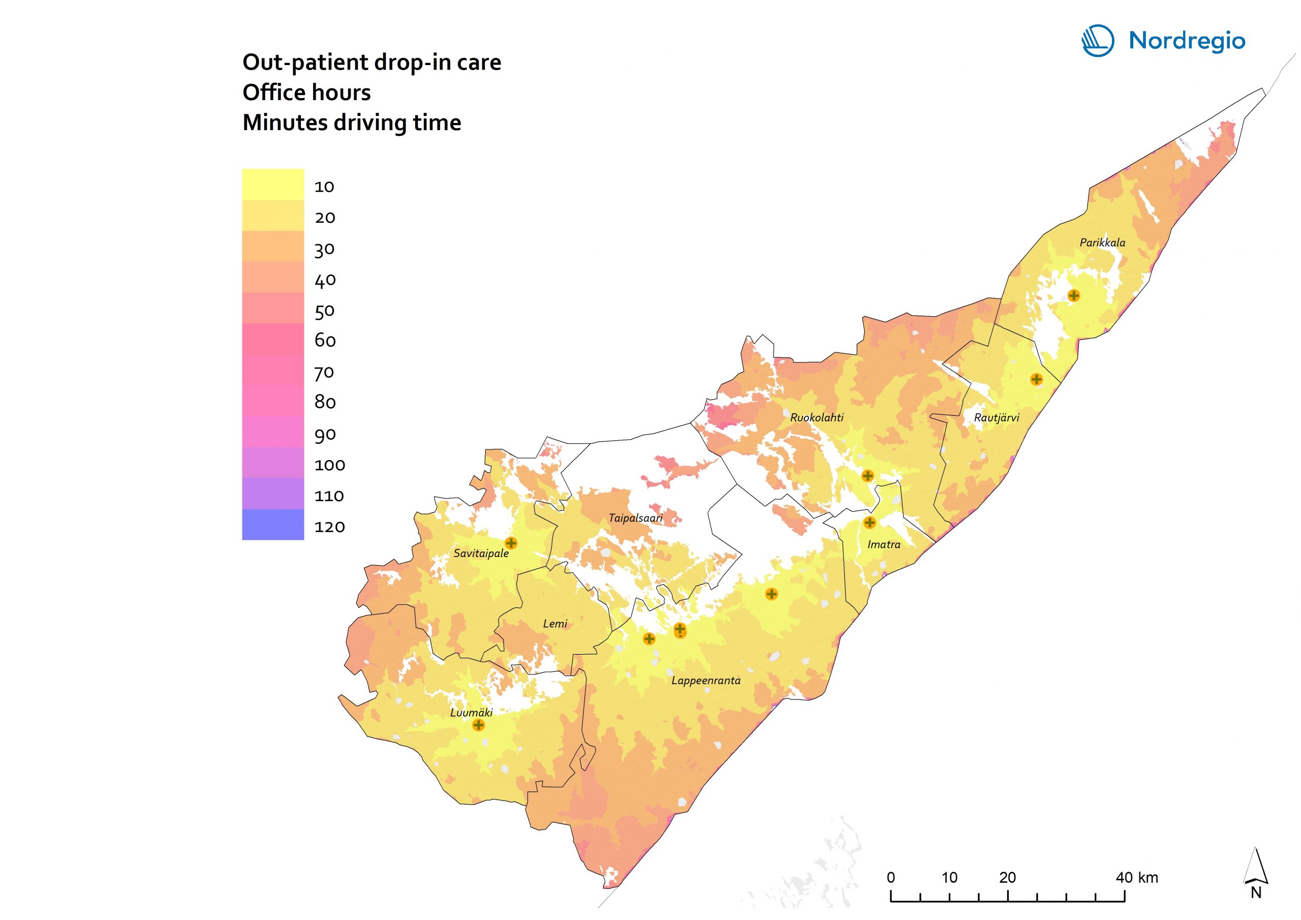 The map illustrates the accessibility of out-patient drop-in care during office hours in South Karelia in Finland. The colours represent car ride times in minutes from the place of residency to the nearest health care facility within a certain service type, with a travel range of 10 minutes to two hours. The health care facilities are also located on the map.