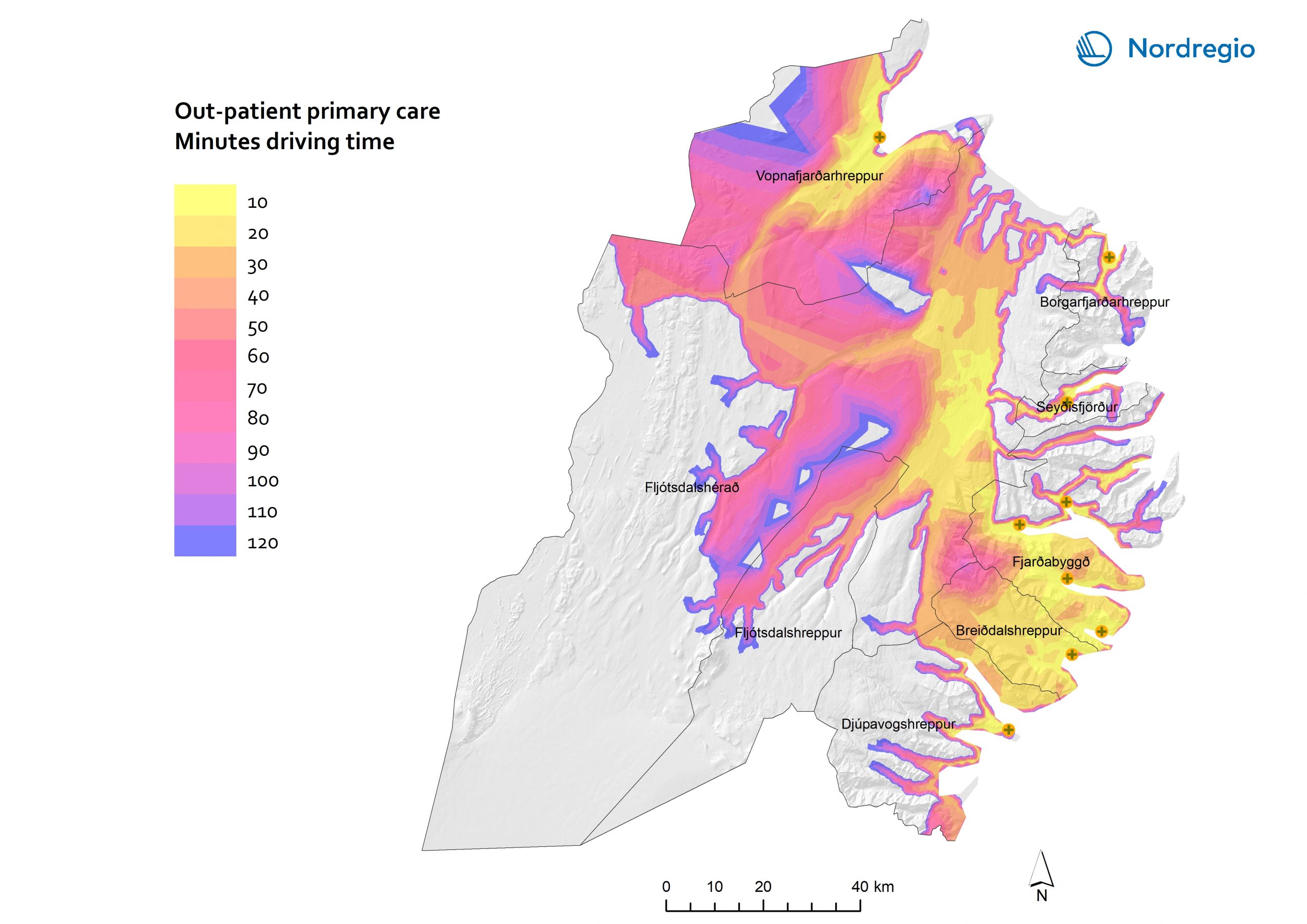 The map illustrates the accessibility of primary care in Eastern health region in Iceland. The colours represent car ride times in minutes from the place of residency to the nearest health care facility within a certain service type, with a travel range of 10 minutes to two hours. The health care facilities are also located on the map.