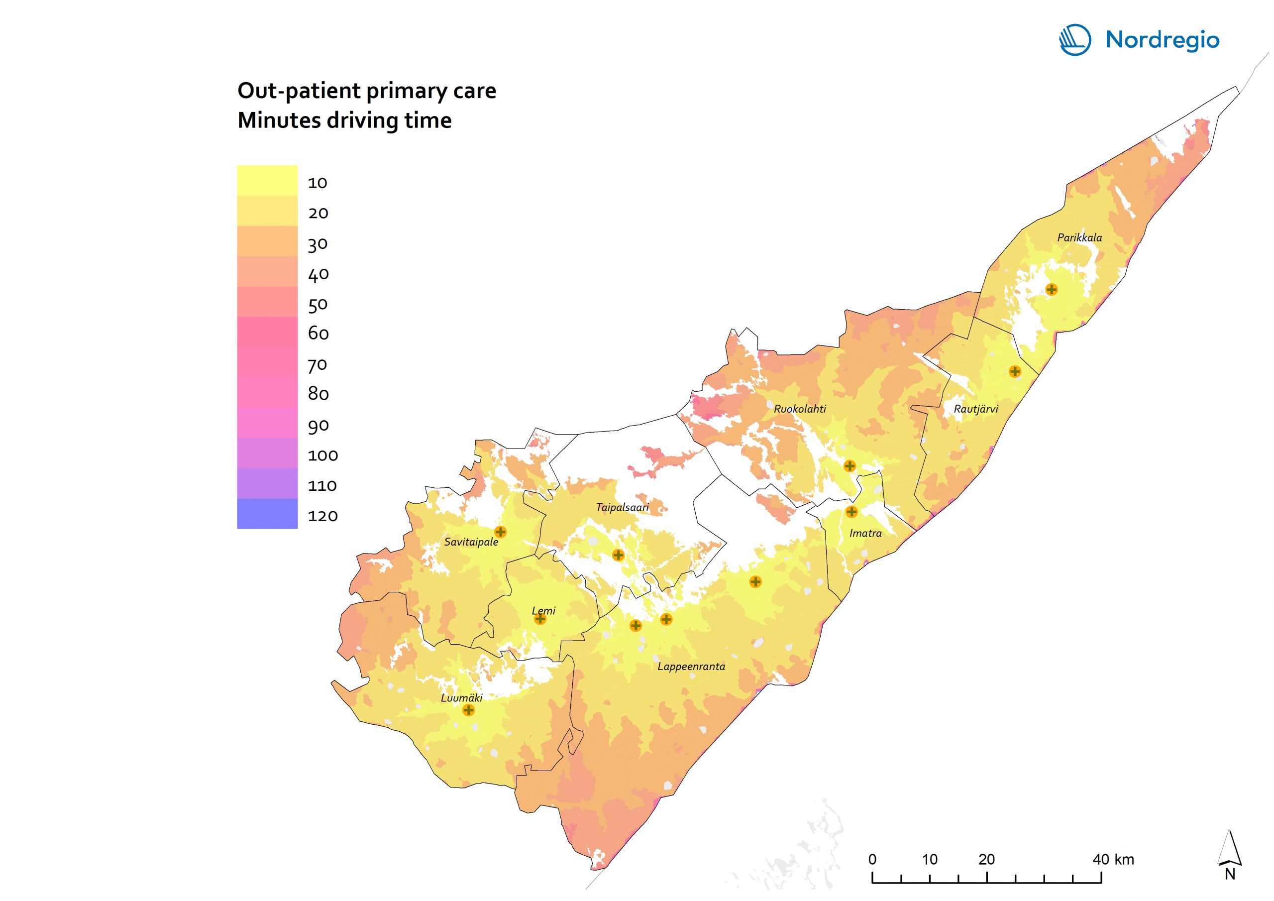 The map illustrates the accessibility of primary care during office hours in South Karelia in Finland. The colours represent car ride times in minutes from the place of residency to the nearest health care facility within a certain service type, with a travel range of 10 minutes to two hours. The health care facilities are also located on the map.
