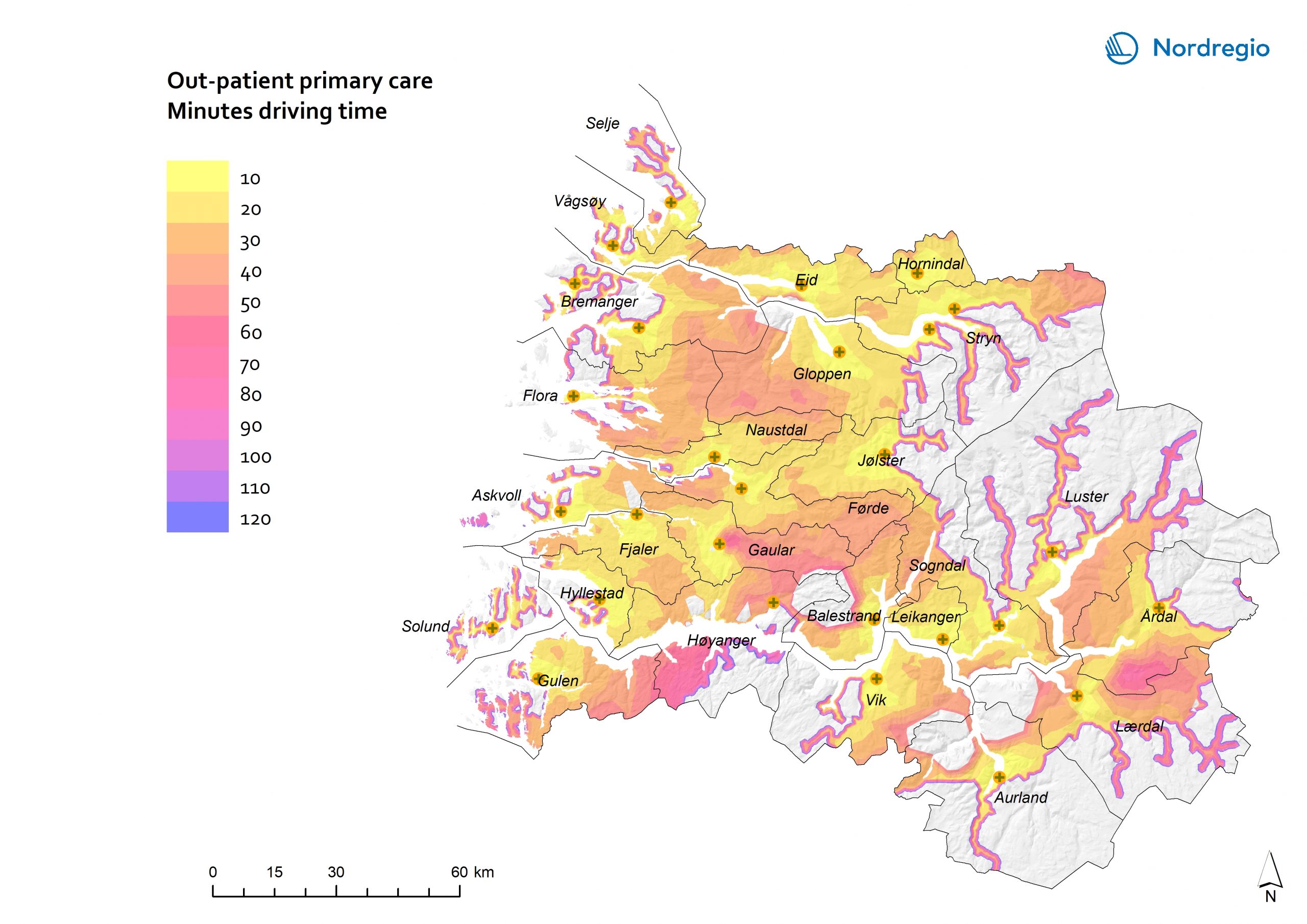The map illustrates the accessibility of primary care in Sogn og Fjordane in Norway. The colours represent car ride times in minutes from the place of residency to the nearest health care facility within a certain service type, with a travel range of 10 minutes to two hours. The health care facilities are also located on the map.