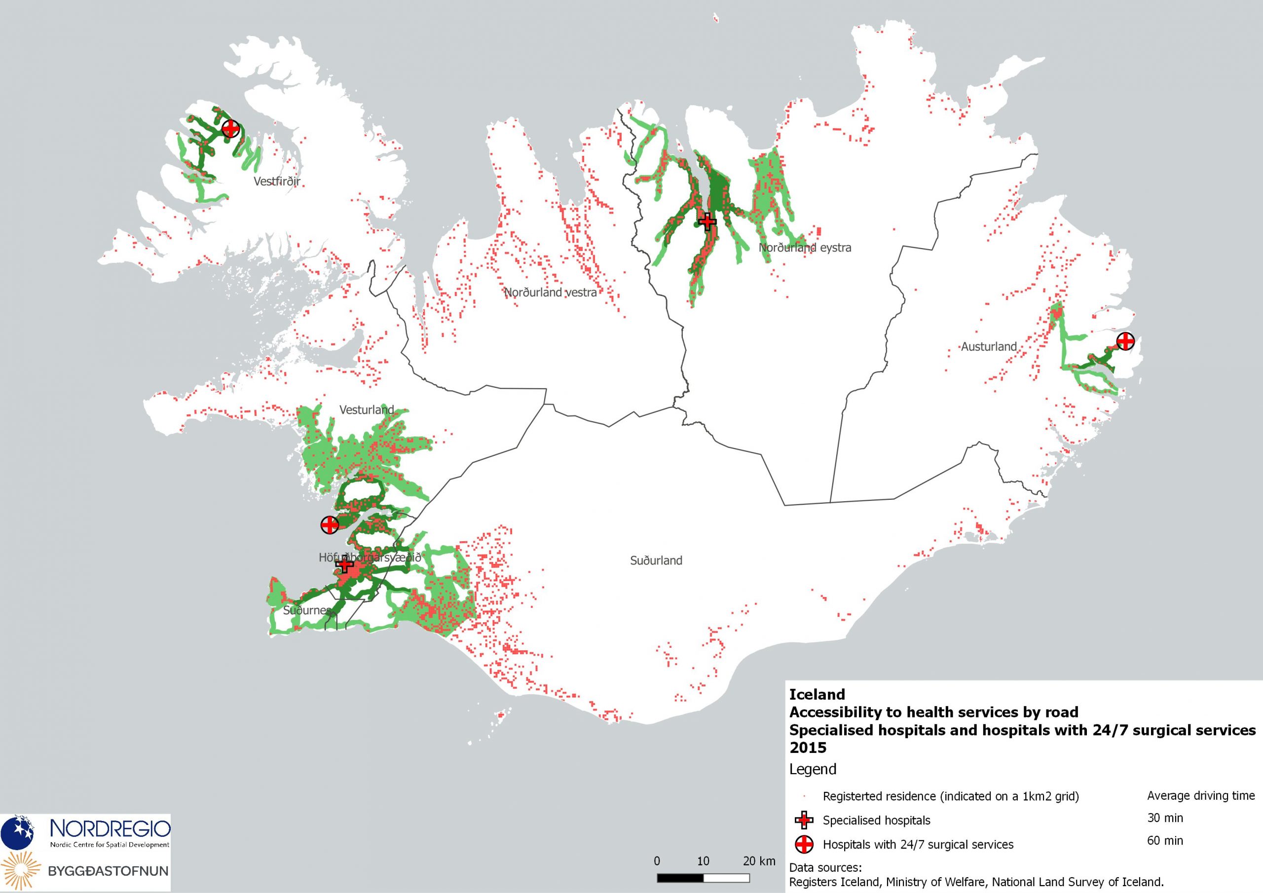 The map shows the accessibility to both specialised hospitals and hospitals with 24/7 surgical services in Iceland. Apart from the two hospitals providing specialised care, three more health care facilities providing 24/7 surgical services in the country. Nearly 80% of the inhabitants (76.2%) can access such health care services within a 30-minute car ride, and a car ride of one hour covers 89.4% of the Icelandic population who need such a service.