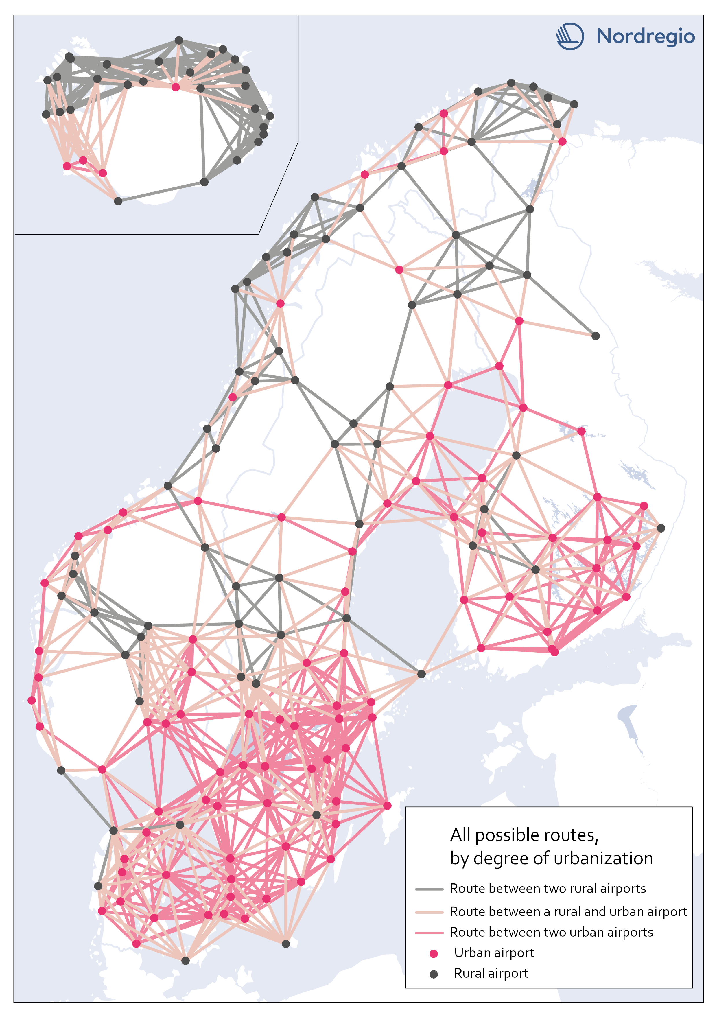 The map shows all routes with a maximum distance of 200 km divided into three categories, based on the airports’ degree of urbanization: Routes between two rural airports, routes between one rural and one urban airport and routes between two urban airports. The classification is based on the new urban-rural typology.