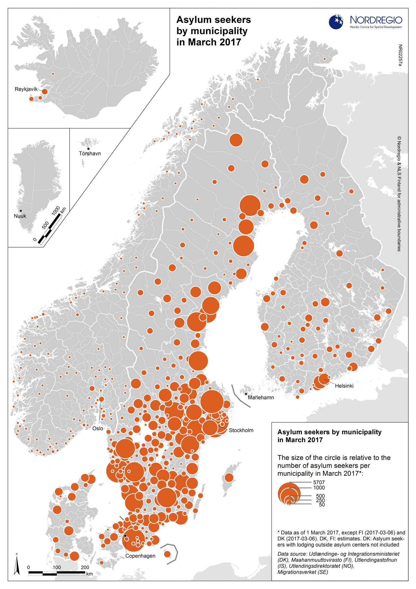 The map shows that, in March 2017, a large portion of the asylum seekers in the Nordic Region were housed in Sweden. In fact, the 35 Nordic municipalities hosting the largest number of asylum seekers in March 2017 were all in Sweden, housing between 760 and 5707 asylum seekers each. It is worth noting that the municipalities housing the largest number of asylum seekers are not necessarily those which are the largest numbers in the context of the population, for example, several municipalities along the coast of Norrland.