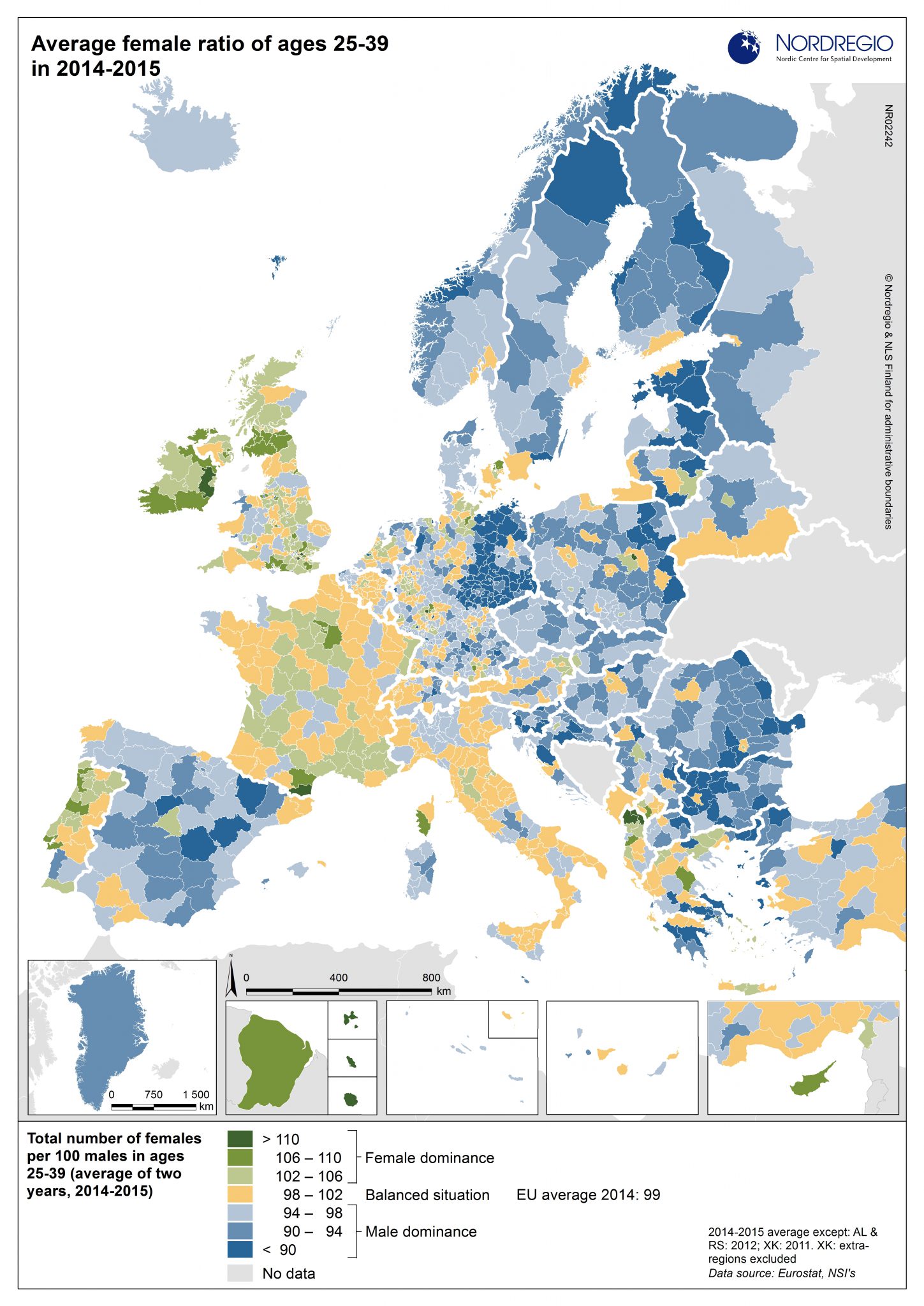 This map shows the number of females aged 25-39 years per 100 males of the same age across Europe’s NUTS 3 regions. The female ratio score for each region is calculated using the average over two years, 2014-2015.