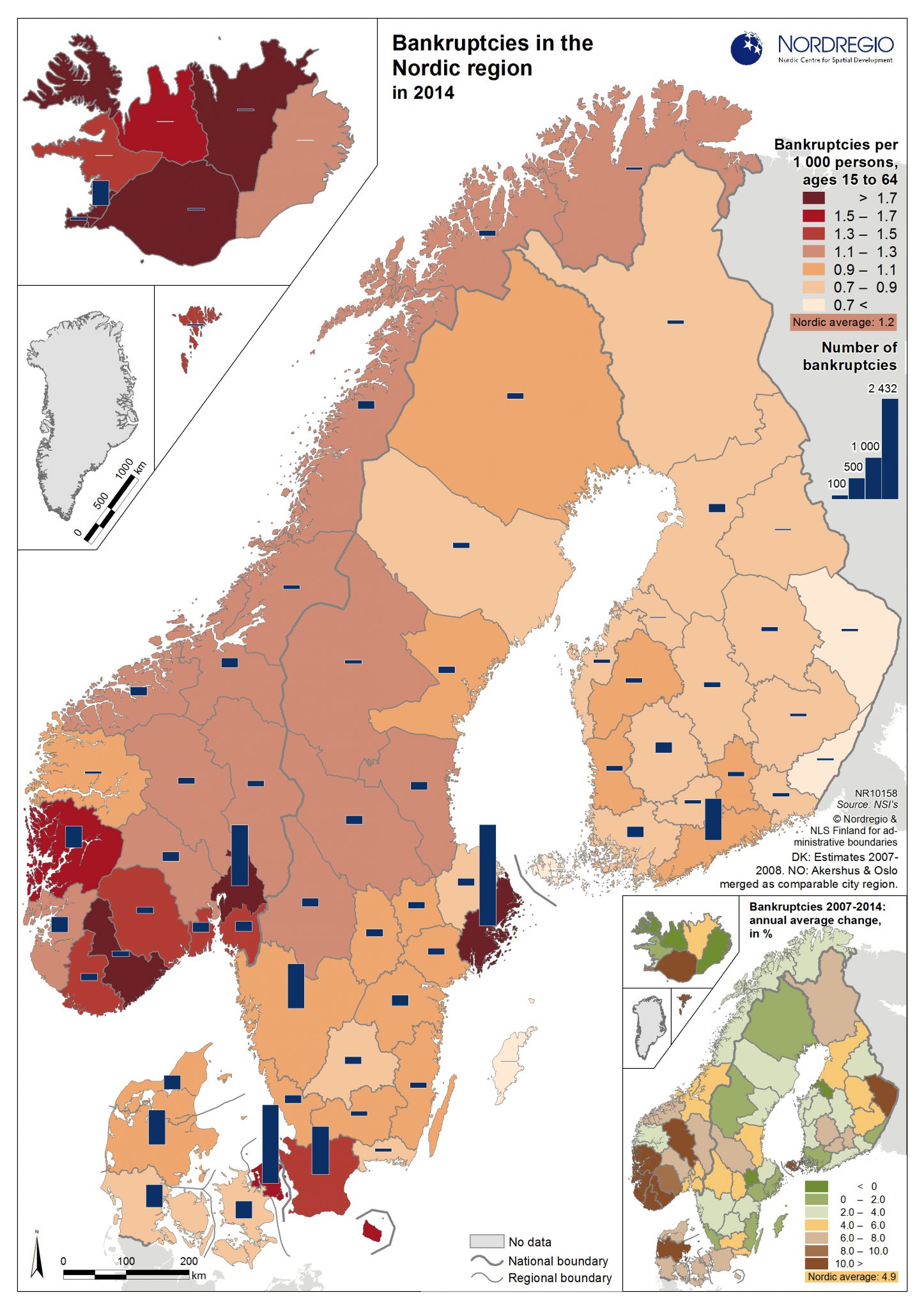 The map in the bottom right corner shows the annual average change of bankruptcies from the first year of the global financial crisis (2007) up to 2014. The increase in bankruptcies is most pronounced in Denmark and the Faroe Islands, as well as in several southern regions of Norway – on the negative side of the Nordic average at 4.9% (brown hues). Iceland, Sweden and Finland have a more balanced situation, with many regions which saw a moderate average increase in bankruptcies during this period, below the Nordic average (green) or close to the Nordic average (yellow). A few regions in Iceland, Sweden and Finland even experienced a decrease in bankruptcies, i.e. an annual average change below 0% (dark green).