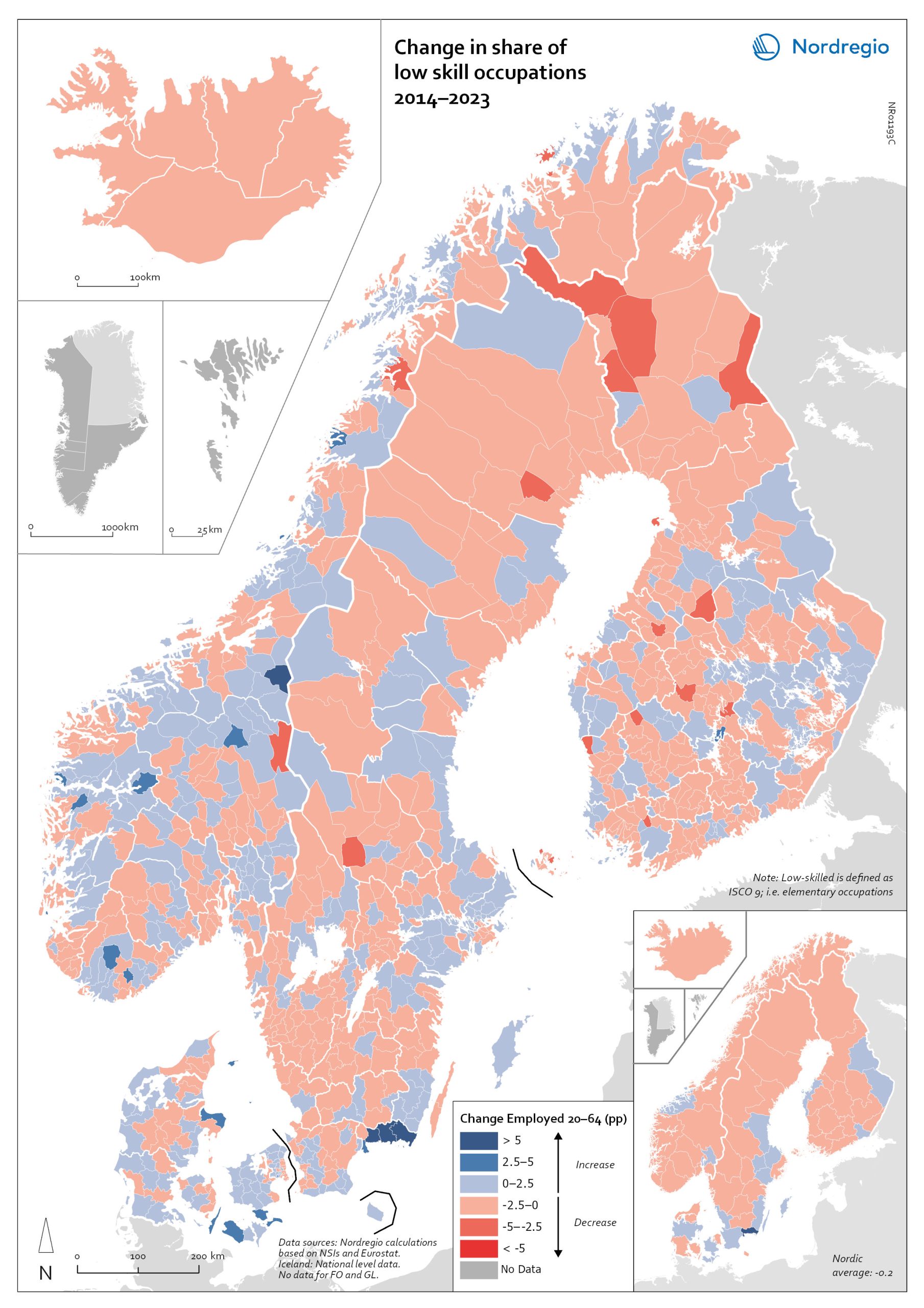 This map shows the change in share of population (20–64) in low skill occupations change, 2014–2023.