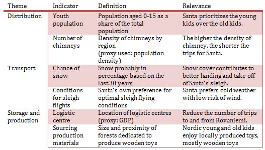 Nordregio’s Christmas Potential Index (CPI) is made up of indicators that have been carefully selected because of their implications for the level of Christmas-ness of kids and older kids (i.e. adults). The CPI aims at helping Santa to plan his Nordic delivery in the most efficient way possible. The selected indicators offer strong communicative value allowing the ranking to be easily understood and widely used by the givers (Santa and his helpers) and the beneficiaries (kids and old kids). The data has been harmonised and standardised and is drawn from a shaky to a solid data base. The 6 selected indicators are grouped in 3 sub-themes: