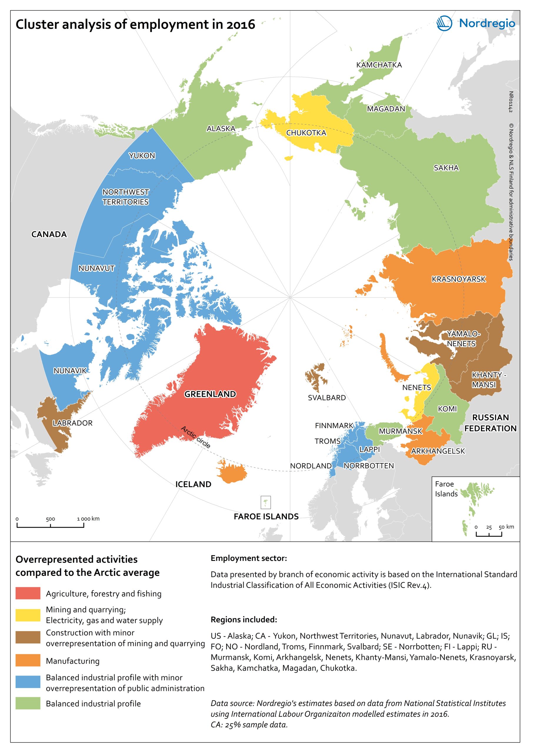 Greenland is more dominated by agriculture, forestry and fishing branch due to the strong fishery industry. In the Russian Arctic, Nenets had high employment in mining and quarrying branch (oil and gas), while Chukotka had a high employment in electricity, gas and water supply. In Labrador (Canada), Svalbard (Norway), Yamalo-Nenets and Khanty-Mansi (Russian Federation), the primary dominant branch was construction. In addition, mining and quarrying activities were also over-represented in Labrador (Canada) with extraction of minerals and in Yamalo-Nenets and Khanty-Mansi in Russia with extraction of oil and gas. Manufacturing was a more prevailing branch for Iceland, Arkhangelsk and Krasnoyarsk (Russian Federation), including manufacturing of food products, wood, plastic, mineral and metal products, electrical and transport equipment. The majority of the Canadian Arctic and the Nordic Arctic regions had a balanced industrial profile with minor over-representation of public administration. Elsewhere in the Arctic, where large cities are located there were a balanced industrial profile.