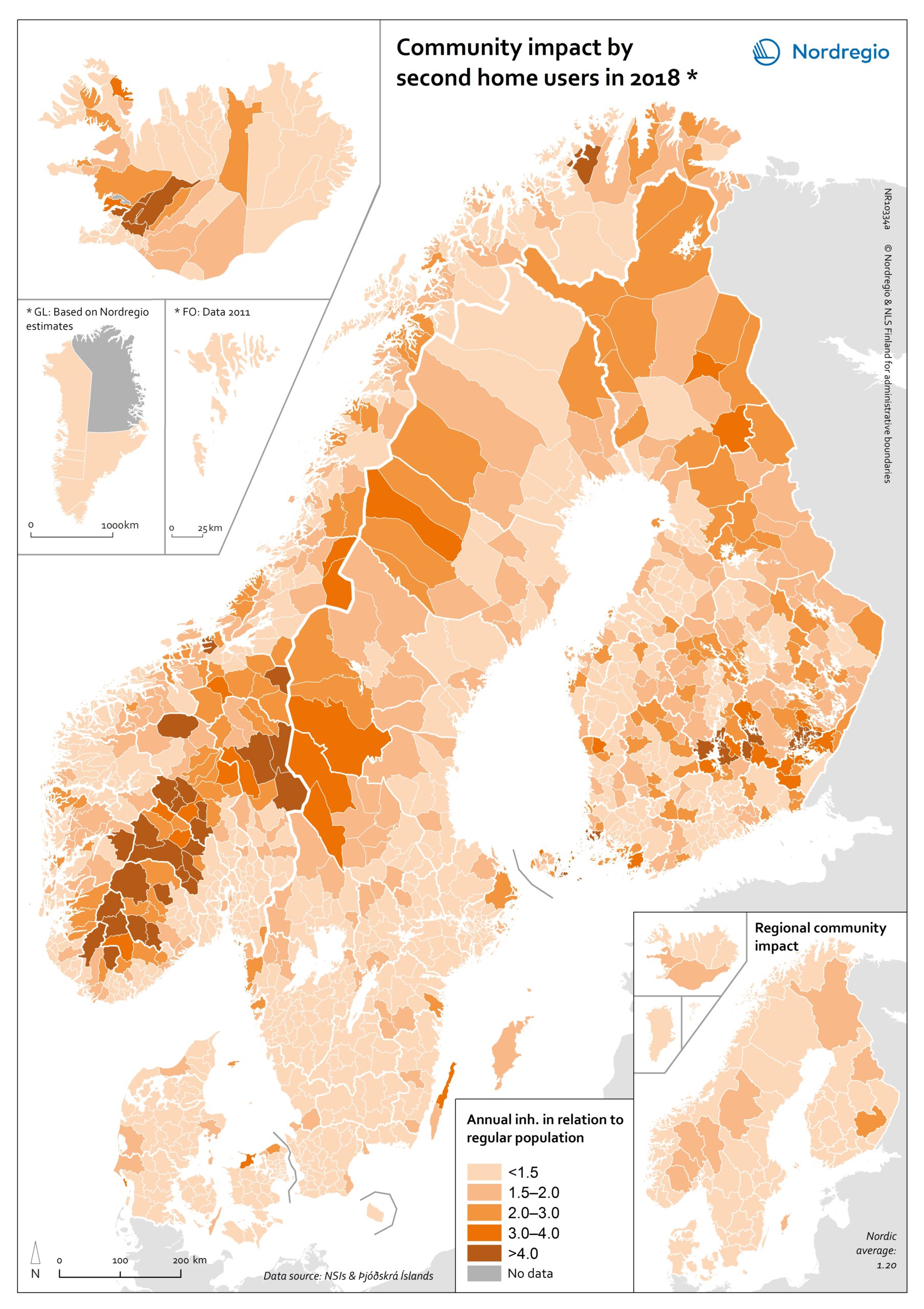 Dark orange tones indicate high impact of seasonal inhabitants and light orange indicates lower impact of the seasonal variation. In populous municipalities with few recreational homes the two population measures (AI & regular population) will be almost identical, yielding a ratio approaching 1. The ratio between the regular population and the calculated annual population is large in municipalities with relatively few inhabitants and a high number of second homes. Nordic average for community impact by second home users was 1.2.
