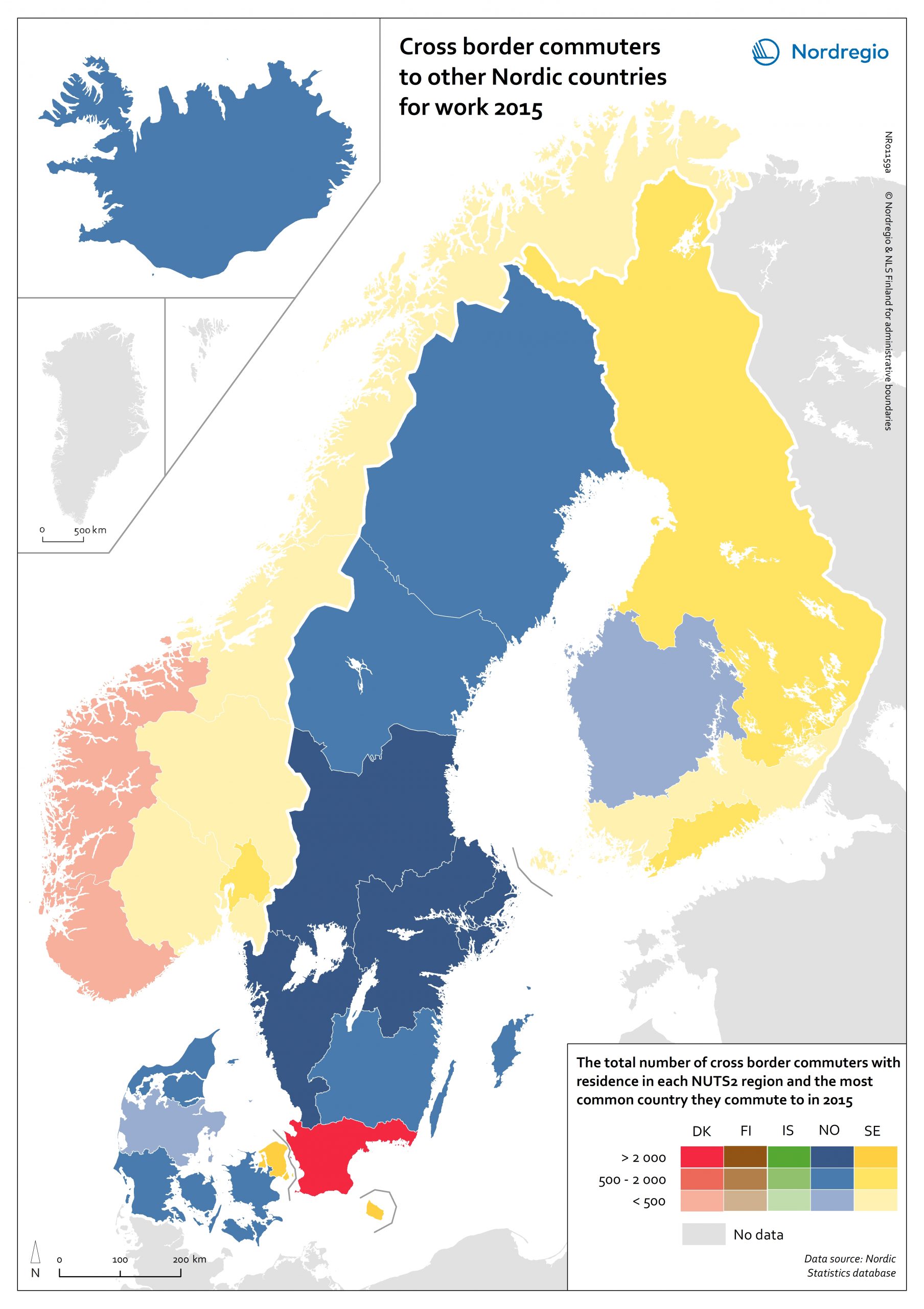 For each NUTS2 region, the map shows the total number of commuters who commute to other Nordic countries for work. The number of commuters is categorised into three groups visualised in different shades: the darker, the higher the number of commuters. In addition, the most common country these commuters commute to from each region is identified by specific colours. For example, the darkest red indicates a region with at least 2,000 commuters working in another Nordic country, of which the largest group number of commuters works in Denmark.