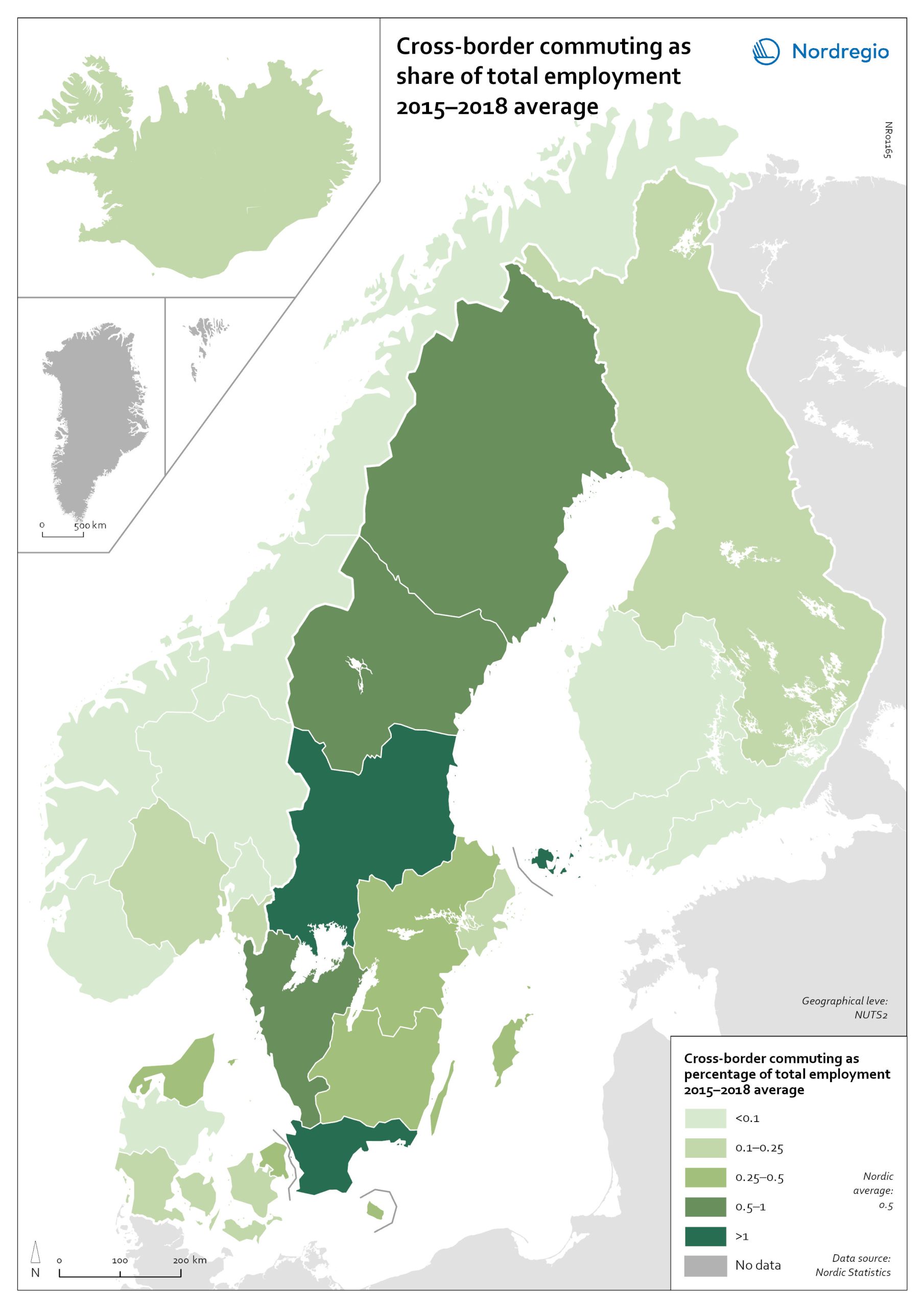 Due to legislative barriers regarding the exchange of statistical data on cross-border commuting between the Nordic countries, more recent data is not available.