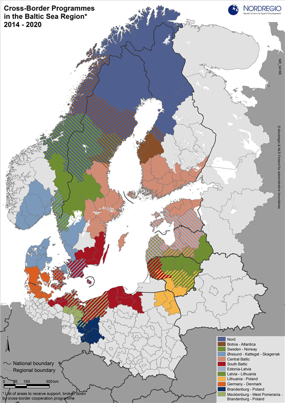 Cross-border Programmes between EU Member States around the Baltic Sea Region for the period 2014-2020. The map shows the geography of the cooperation regions and areas in the implementation of the programmes.