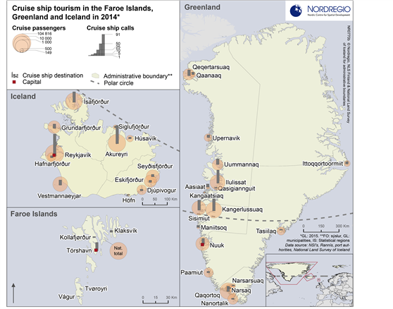 This map shows international cruise ship passengers and calls in the West Nordic countries not including regular, scheduled ferry connections in 2014 (2015 for Greenland as no earlier data is available). The circles indicate the number of cruise passengers and the grey bars represent the number of cruise ship calls in each port.