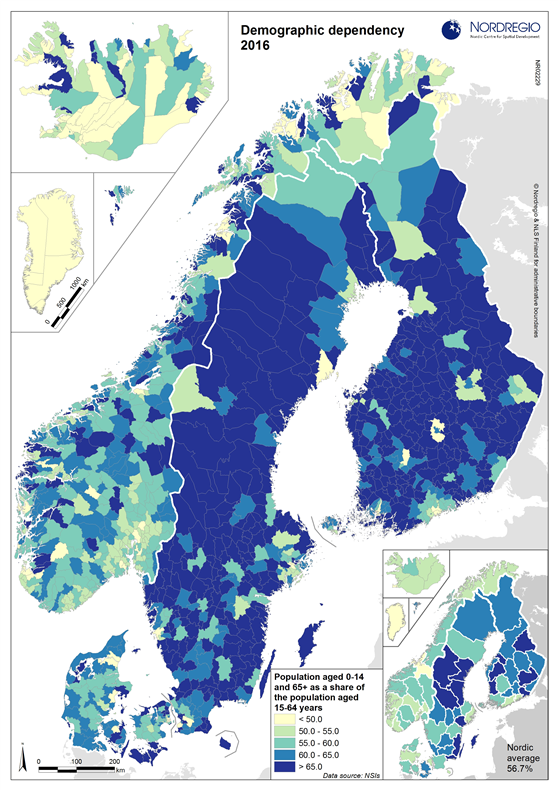 This map shows the percentage of population aged 0-14 and 65 and over as a share of the population aged 15-64 across the Nordic Region at the municipal and regional level in 2016. This figure is often referred to as the demographic dependency ratio.