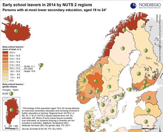 The map indicates variations within the Nordic countries. In Danish regions, the share of early school leavers varies between 7% and 9%. In Norway, Oslo og Akershus and Vestlandet are the only two NUTS 2 regions with rates below 10%. The Swedish regions have among the lowest shares of early school leavers in the Nordic countries. Six out of eight Swedish NUTS 2 regions (riksområden) have a share of early school leavers below 7%, while Hovedstaden in Denmark is the only other Nordic region with a similar rate. In Finland, variations between the NUTS 2 regions (suuralue/storområde) are bigger than in Sweden and Denmark and more similar to the regional variation within Norway. In Åland, the share of early school leavers is estimated to be 11% but Åland students enrolled in studies in neighbouring Sweden are not included in this figure and therefore the true figure is probably smaller. In the Faroe Islands, Greenland, Iceland and northern Norway, the rates are above 15%.