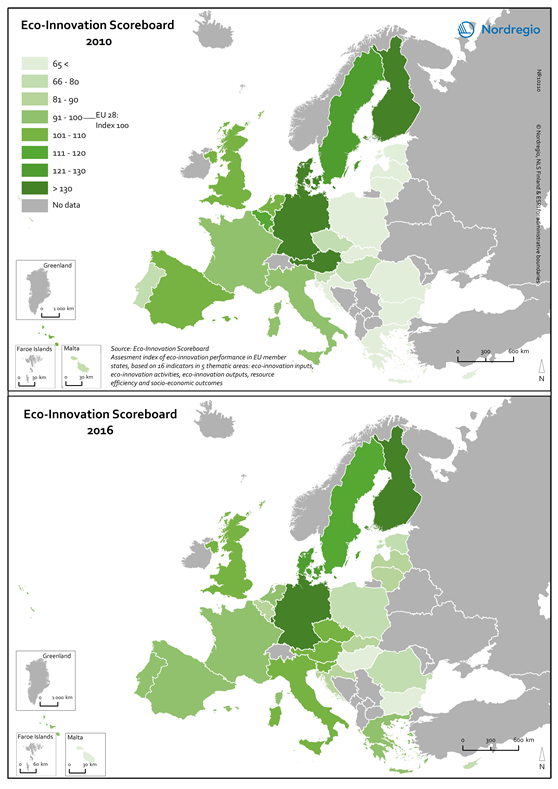 The eco-innovation scoreboard is an index of eco-innovation performance in the EU-member states, based on 16 indicators in 5 thematic areas. It promotes a holistic view of economic, environmental and social performance and complement other measurement approaches in terms of assessing the innovativeness of the EU countries. The green tones indicate differences in eco-innovation performance in the EU-member states in 2010 and 2016. The darker the green, the more performant the state in eco-innovation. The grey colour indicates no data.