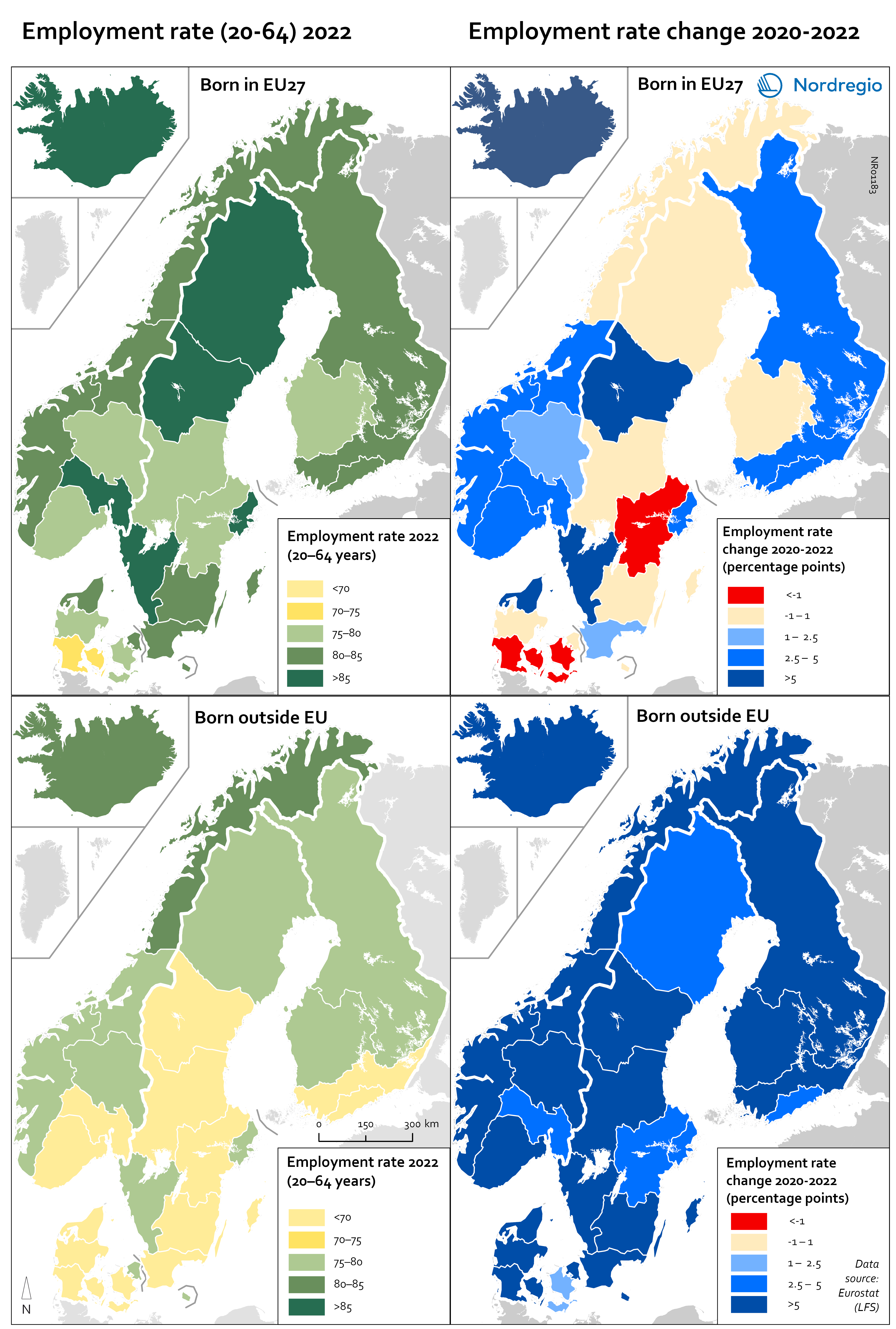 These maps shows the employment rate in 2022 for those born in a EU country (top left) and those born outside of the EU (bottom left), as well as the change in employment rate between 2020 and 2022 for those born in the EU (upper right) and outside the EU (lower right). The data is displayed at NUTS 2 level and comes from the labour force survey (LFS).