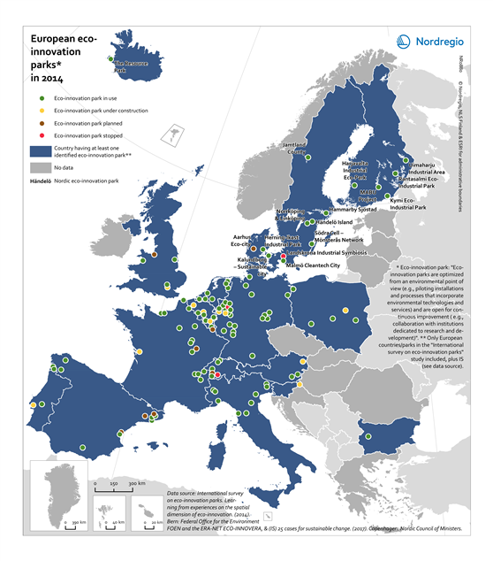 This map shows the location of the European eco-innovation parks in the states of the European Union (EU) and Iceland in 2014. The eco-innovation parks are eco-industrial parks and eco-innovative areas combining residential and industrial activities.