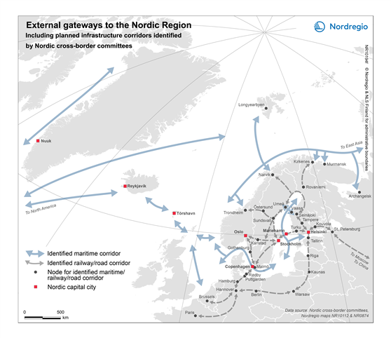 These gateways and corridors are meant to show the importance of further development of movements and infrastructure plans both across Nordic national borders, and between intra-Nordic and global transport networks.
