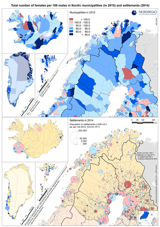 Total number of female per 100 male in Nordic Arctic municipalities (2015) and settlements (2014).