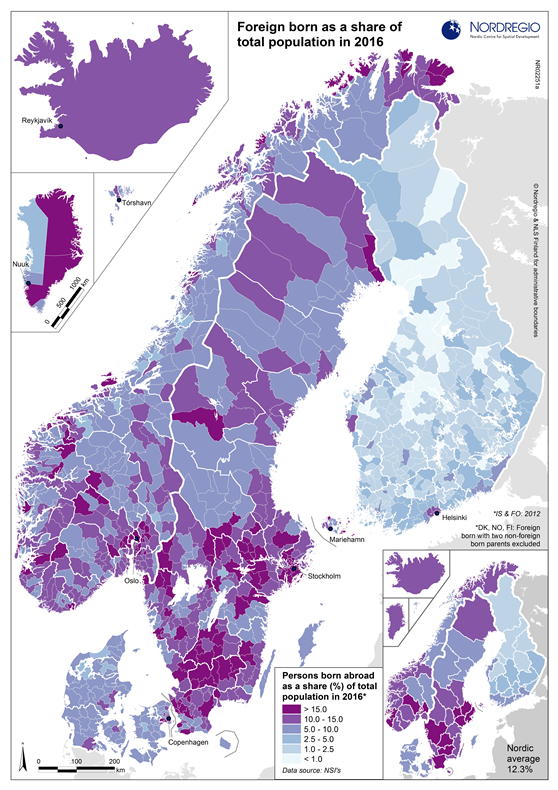 This map shows the number of foreign born inhabitants as a share of the total population for Nordic municipalities and regions in 2016. The darker colours show municipalities/regions where higher shares of the population were born in a foreign country and the lighter colours shows municipalities/regions where the share is lower.