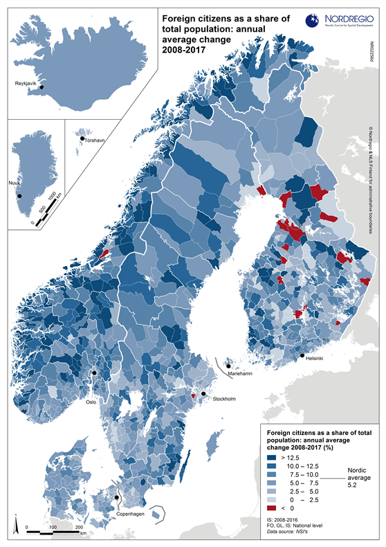 This map shows the annual average change in percent of foreign citizens as a share of the total population for Nordic municipalities during the period 2008-2017.