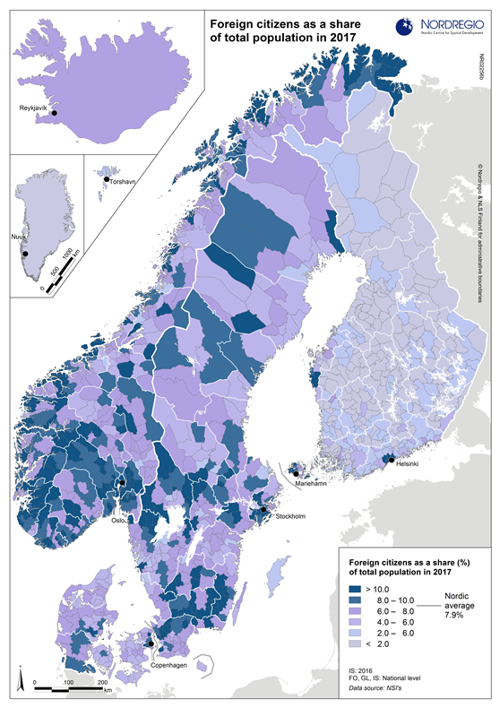 A high share of foreign citizens in the population depends both on immigration rates and the presence of foreign citizens who choose not to become citizens in their country of residence. There are many reasons to not change citizenship, and several explanations to why the shares of foreign citizens vary across the Nordic municipalities. For example, the capital regions and many coastal municipalities in Norway depend to a varying degree on expats or labour-immigrants who capitalise on temporary employment opportunities but do not intend to become long-term residents. In some Nordic border regions, what starts out as cross-border commuting may lead to settling in the neighbouring country (due to good infrastructure connections, closeness of the languages, etc.). In some areas, such as Finnish Närpes, local or regional strategies to address the relative lack of local labour supply have resulted in foreign citizens moving there.