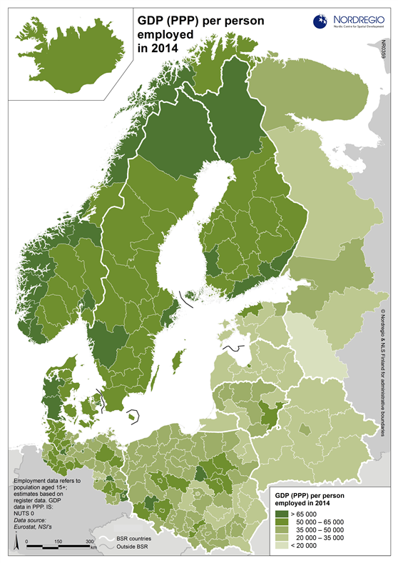 This map shows gross domestic product (in purchasing power parity) per person employed. GDP (PPP) per person employed is an indicator on labour productivity. It indicates how much output a given number of employees produce. As it includes the total production by persons actually employed in the region, it gives a more truthful picture than the standard indicator GDP per capita (which relates the GDP to the entire population).