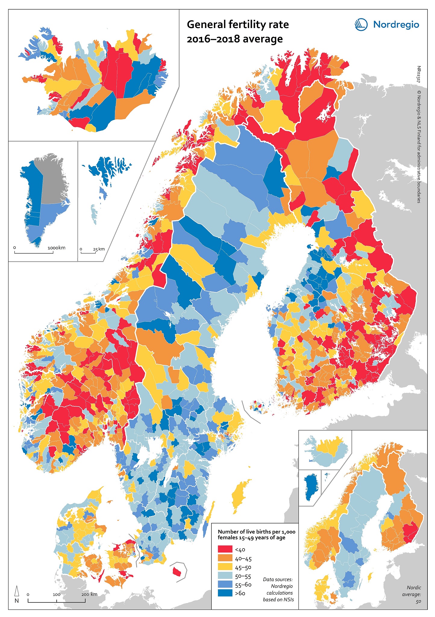 The number of children that families have is influenced by a variety of political, economic and cultural factors. Over the past decade, there has been a decline in fertility in most Nordic countries, with quite a steep decline in Finland, Norway and Iceland. The map reflects these national differences in fertility but also show some internal regional variation. While most of Finnish municipalities have a general fertility rate below the Nordic average of 50 births, some parts of Keski-Pohjanmaa and Pohjois-Pohjanmaa have more than 60 births per woman in childbearing age.