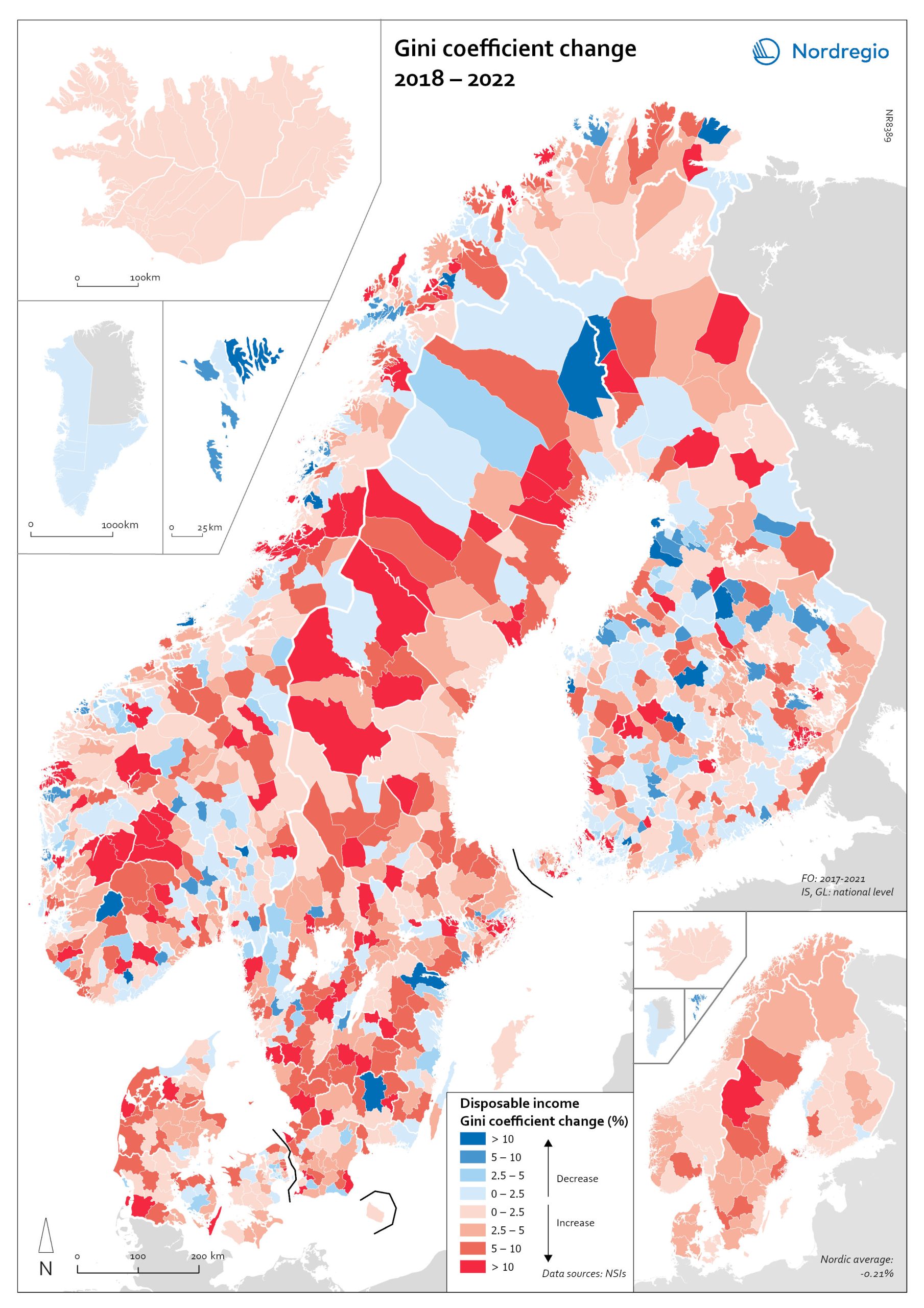 The map illustrates significant variations in the change in income inequality across Nordic municipalities and regions. Between 2018 and 2022, income inequality increased in predominantly rural municipalities, notably in Jämtland, Gävleborg, Dalarna and Västerbotten in Sweden, as well as Telemark in Norway. For Denmark, the rise in inequality is mainly for the municipalities in Western Jutland.