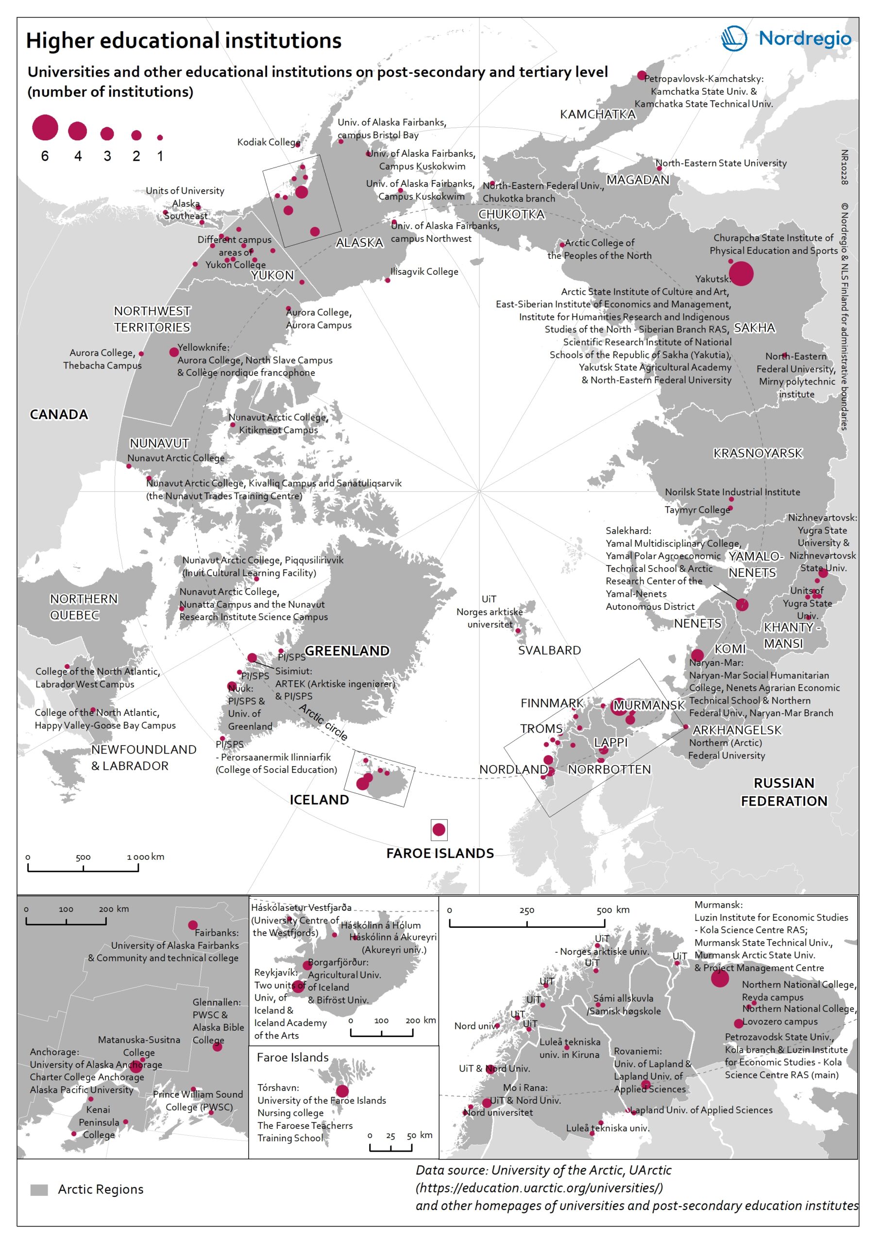 The map shows universities and other educational institutions on post-secondary and tertiary level located in the Arctic.