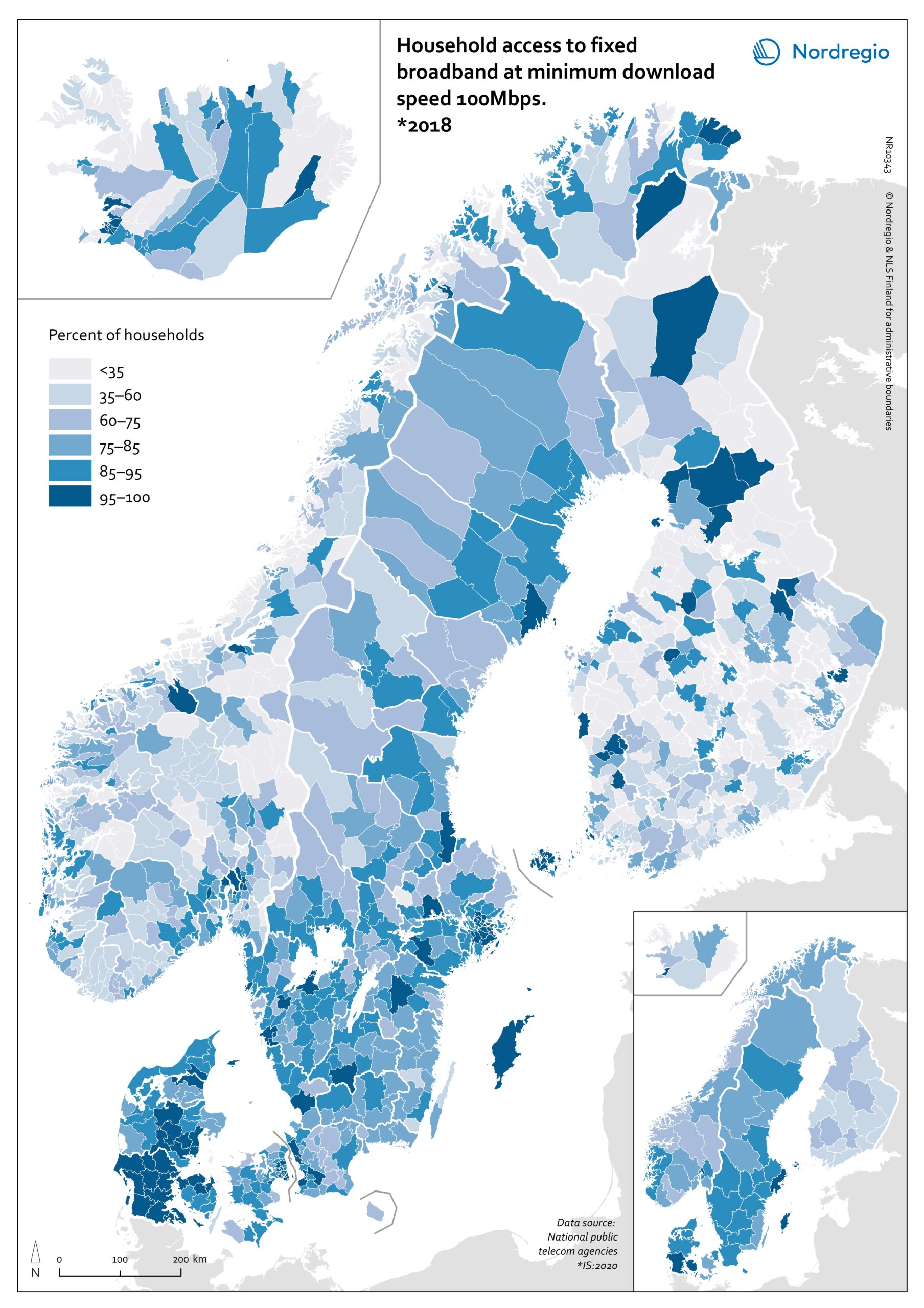 The map measures progress towards these targets, showing the percentage of households with access to a fixed-line broadband connection with a minimum download speed of 100 Mbps in 2018.* Darker shading represents proportionally higher levels of coverage. According to the map, a substantial proportion of households (>75%) had access to 100 Mbps in most Danish municipalities in 2018. Sweden also has relatively good fixed broadband coverage across most of the country, though there are several municipalities where coverage drops below 60% of households. The most limited coverage can be found in Finland, parts of Norway and the Westfjords and easternmost municipalities of Iceland.