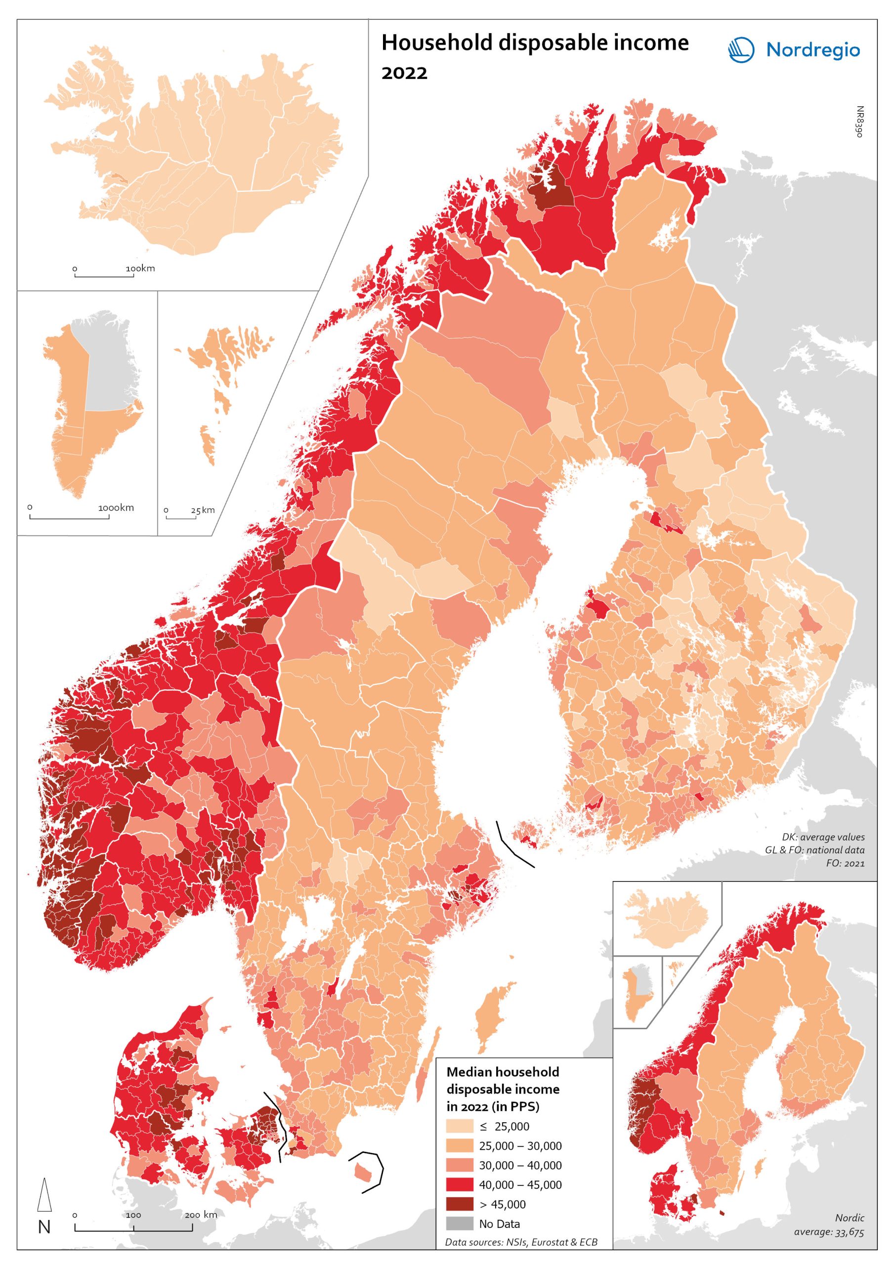 The map shows the intra-municipal differences in household disposable income in PPS, which reveals the different patterns in the Nordic countries. Norwegian coastal municipalities have slightly higher household disposable income than inland municipalities, with some exceptions. Finnish, Icelandic, and Swedish municipalities generally have much lower household disposable income compared to Norwegian and Danish municipalities, except for the larger urban areas. In Denmark, most municipalities are at a similarly high level, except for remote islands in the south. The differences between the Icelandic municipalities are rather small, at a medium to lower level.