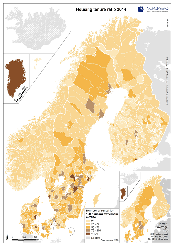 Housing ownership in different forms is strong in the Nordic countries overall. The map illustrates the entrenched position of housing ownership; it also illustrates the relatively stronger position of rental tenure in Sweden and Denmark in comparison to the other Nordic countries. Rental housing is predominant mainly in municipalities in or near the bigger cities in Sweden, Denmark and Finland, for example in municipalities around Copenhagen such as Brøndby and Albertslund, in Södertälje and Sundbyberg in the Stockholm region and in Helsinki municipality. However, rental tenure is also strong in municipalities like Århus (Denmark), Fredericia (Denmark), Landskrona (Sweden), Turku (Finland) and Lycksele (Sweden).