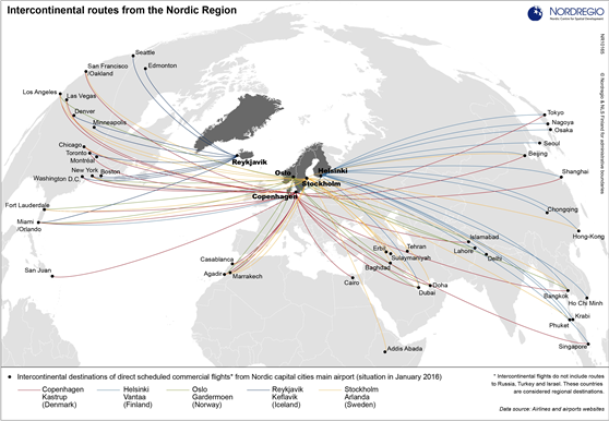 The following map highlights intercontinental routes with an origin or destination in the main airport of each capital city in the Nordic countries. The map only includes direct scheduled commercial flights having at least one weekly flight, and it does not include connecting flights, charters or cargo routes. Both North America and East Asia are relatively well connected to the Nordic countries, as are the Middle East and South East Asia, though to a lesser extent. There a limited number of routes to Africa from the Nordic countries, and a complete lack of any routes to South America.