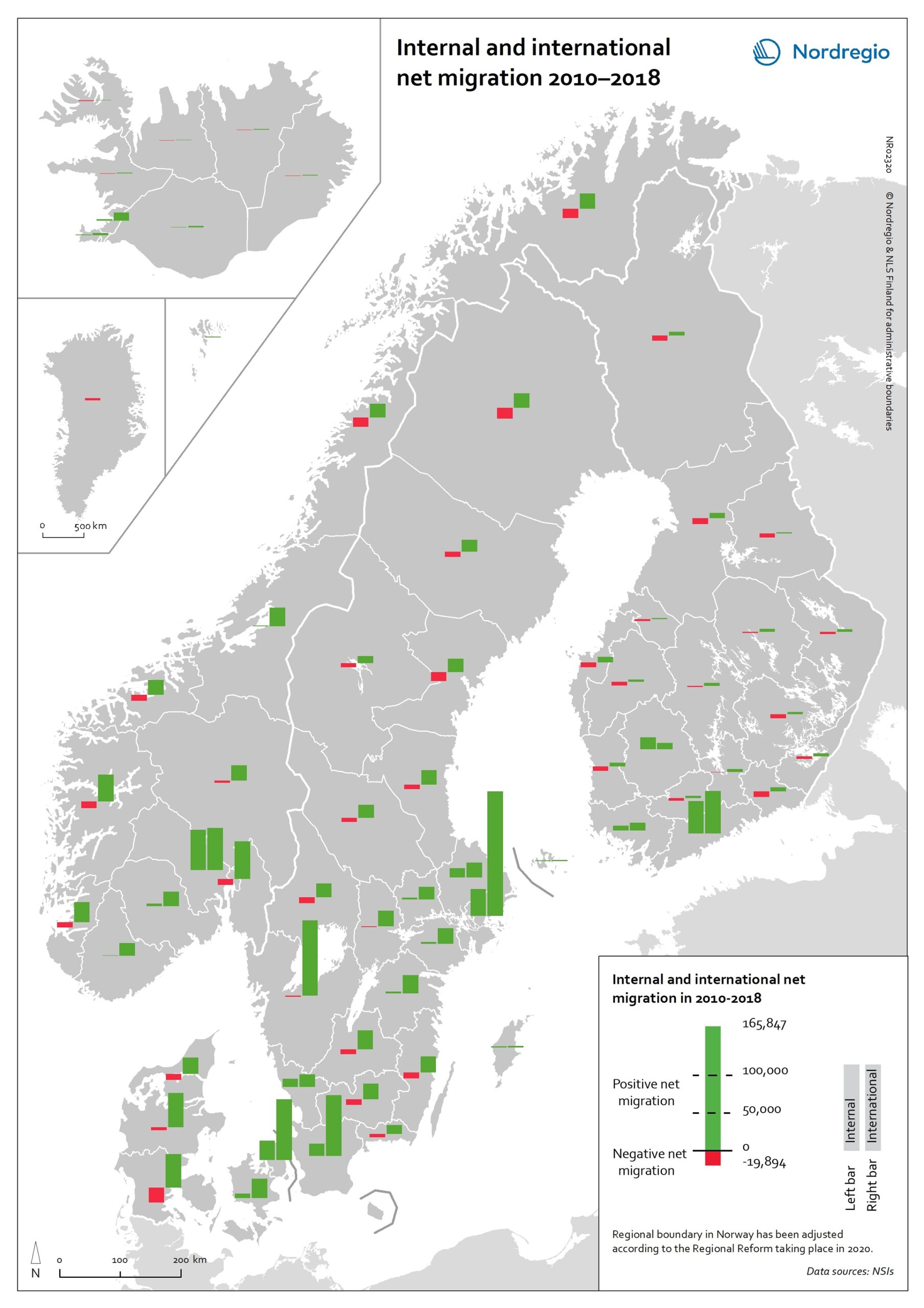 The map shows the combination of domestic migration (left-hand bar) and international migration (right-hand bar), with red indicating net out-migration and green indicating net in-migration, for the 66 regions within the Nordic Region in the period 2010 to 2018. The size of the bar indicates the size of the net flows. All regions have had positive international migration since 2010, which is not surprising given the size of the international migration flows into the Nordic Region in recent years.