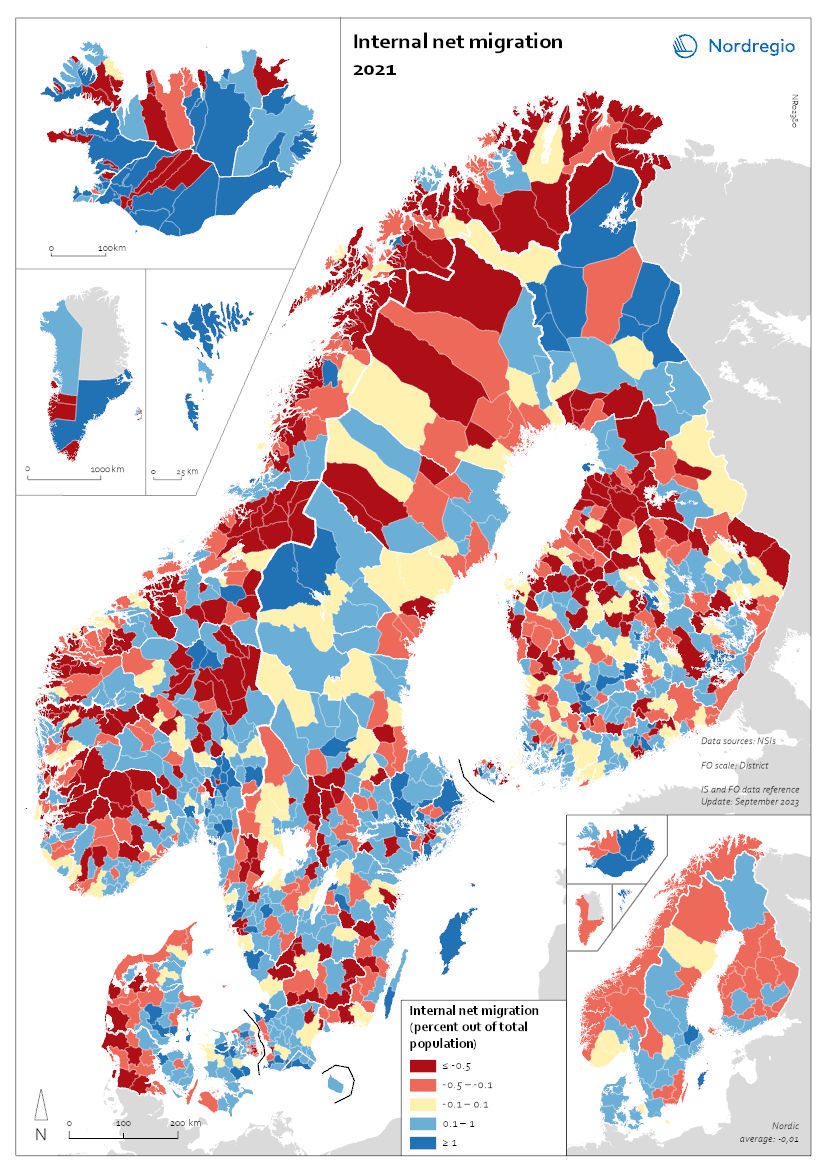 This map shows the internal net migration in 2021 as a percentage of the total population. The small map shows the result on a regional level, and the big map on the municipal level. Internal (sometimes referred to as domestic) net migration refers to migration between municipalities and regions within the same country. International migration is excluded.