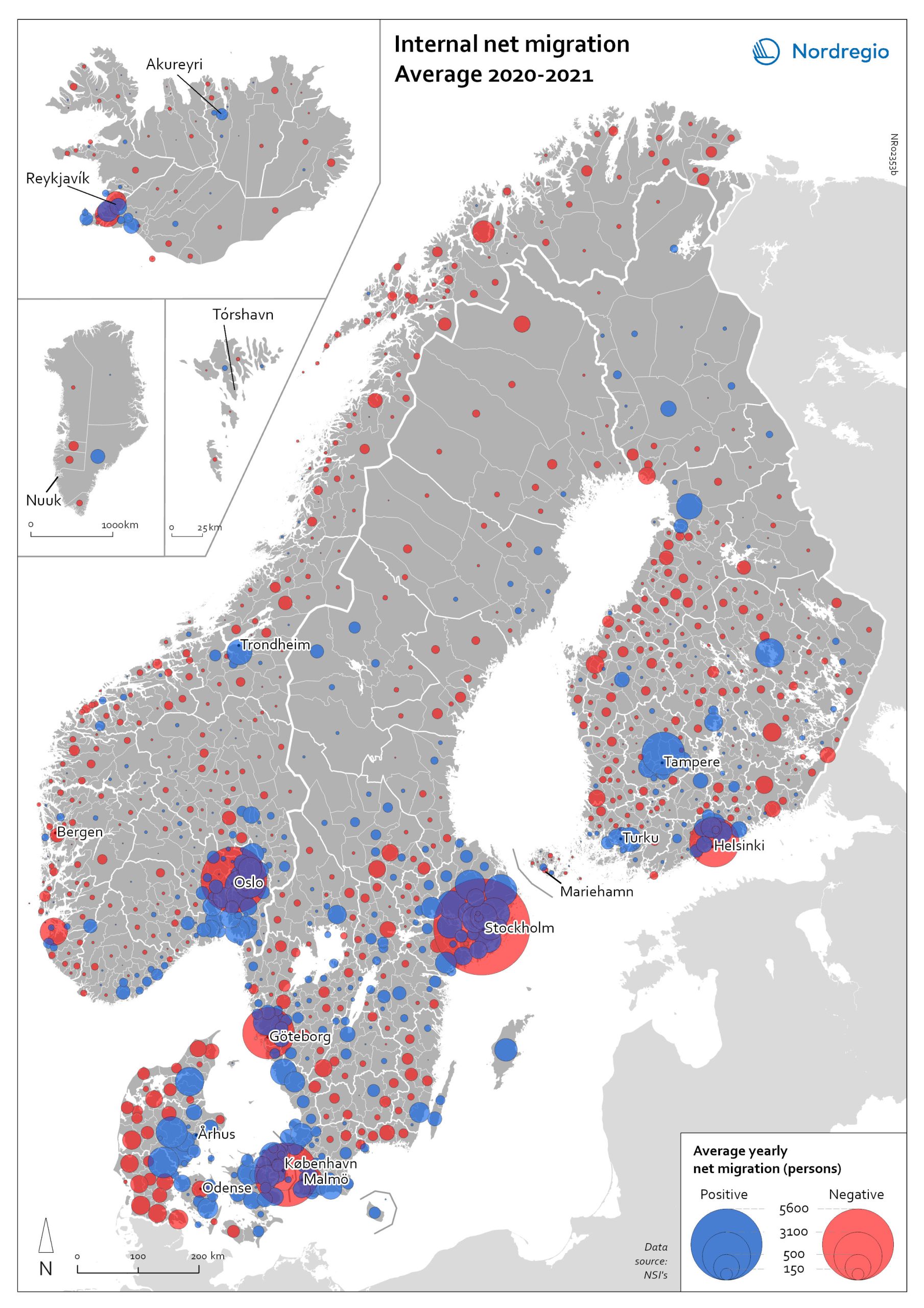 The map shows the average internal net migration in 2020 and 2021 for Nordic municipalities.