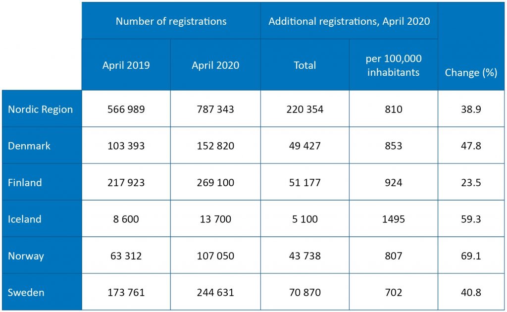 It is important to note that the labour market situation in April 2019 has some baring on the results shown on the map. For example, the appearance of a sharper relative increase in Norway is primarily due to the lower number of unemployment registrations in April 2019, compared with the other Nordic countries (see table below). In absolute terms, the increase in the number of unemployment registrations was actually highest in Sweden (70 870) and Finland (51 177). Once the size of the population is taken into account, the number of registrations is highest in Iceland and lowest in Sweden.