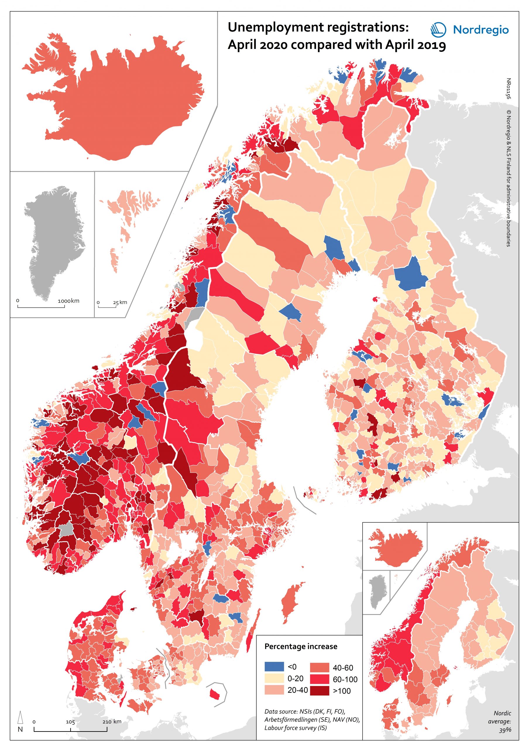 The map shows the number of people who registered as unemployed in April 2020 compared with the number of people who registered as unemployed in April 2019 at the municipal level for Denmark, Finland, Norway and Sweden and Åland Islands and at the national/territory level for Iceland and the Faroe Islands. The shading represents the increase in percent, with darker colours showing higher relative increases compared to the previous year and lighter colours lower relative increases. Municipalities shaded in blue on the map did not experience an increase in unemployment registrations in April 2020 compared to April 2019.