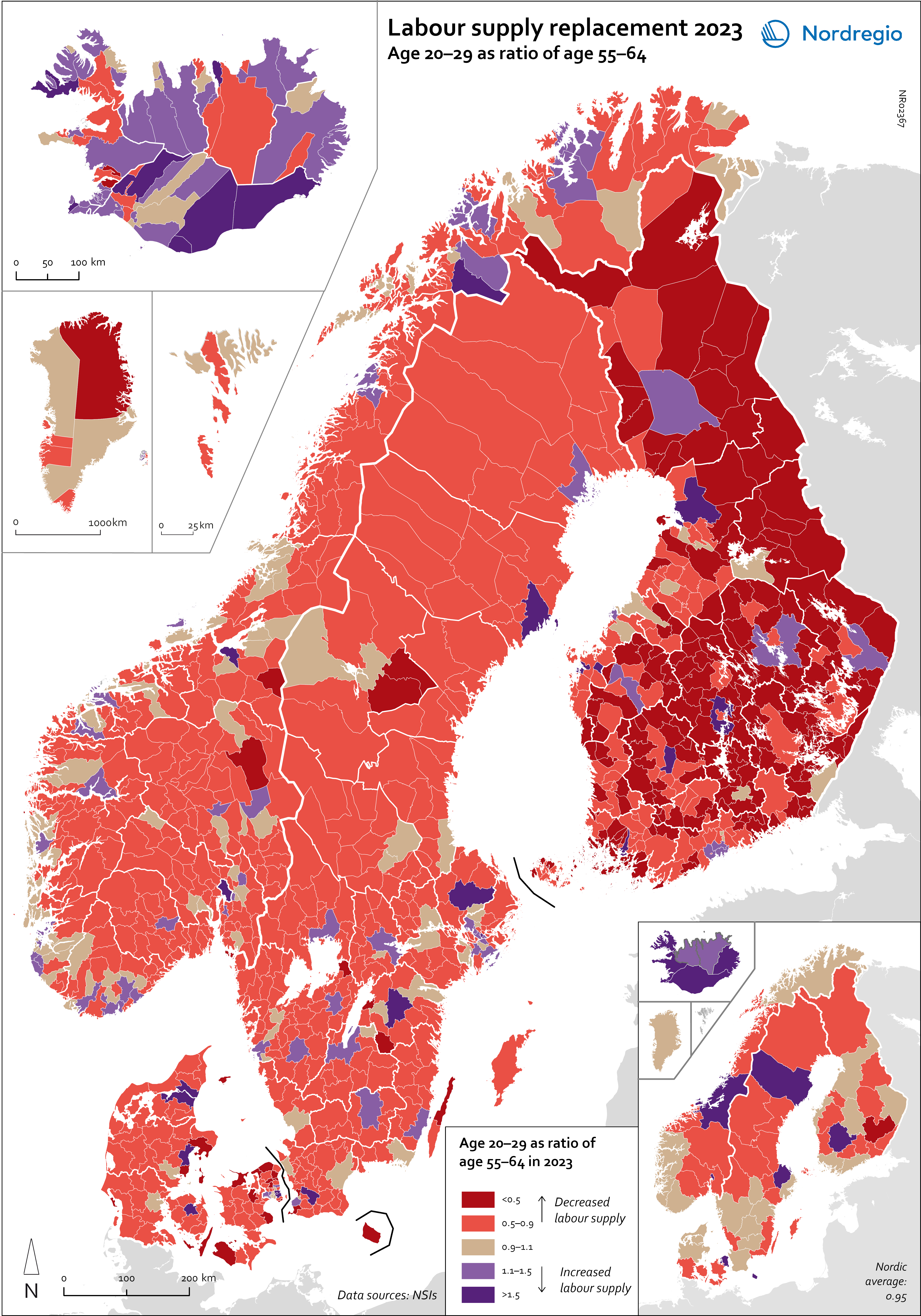 For the Nordic Region as a whole, the ratio is 0.95, meaning that there are slightly fewer people in the age group 20–29 than 55–64. Iceland is the only country with a ratio above 1 (Iceland: 1.3; Greenland: 0.99; Denmark: 0.97; Norway: 0.95; Finland: 0.94; Sweden: 0.93; Faroe Islands: 0.88; Åland: 0.63). All of the Icelandic regions, as well as the capital regions of Norway, Denmark and Finland, have a ratio above 1. In Sweden, the highest ratios are in Uppsala (1.25), Västerbotten (1.14) and Östergötland (1.03), while the ratio in Stockholm is below 1 (0.95). The lowest ratios are found in Etelä-Savo (0.62) and Åland (0.63) in Finland, Sjælland (0.63) in Denmark, Västernorrland (0.74) in Sweden, and in Vestfold og Telemark (0.78) and Viken (0.77) in Norway. However alarming these trends and developments are, they are neither new nor undescribed. An analysis of the factors and policy strategies that are influencing these developments enables adjustments to be made to future trends.
